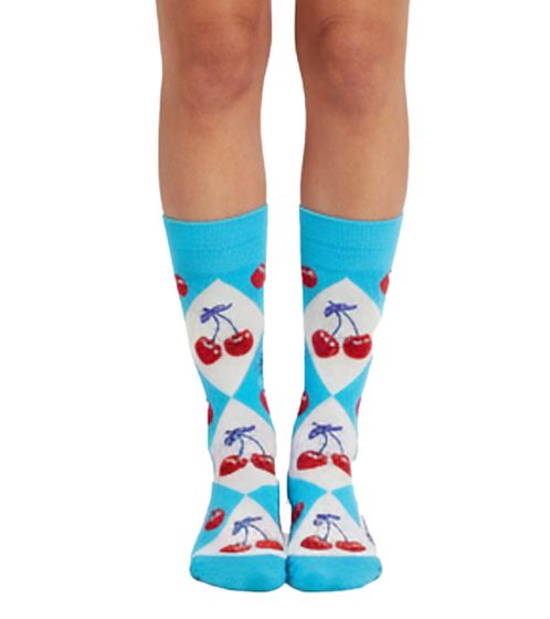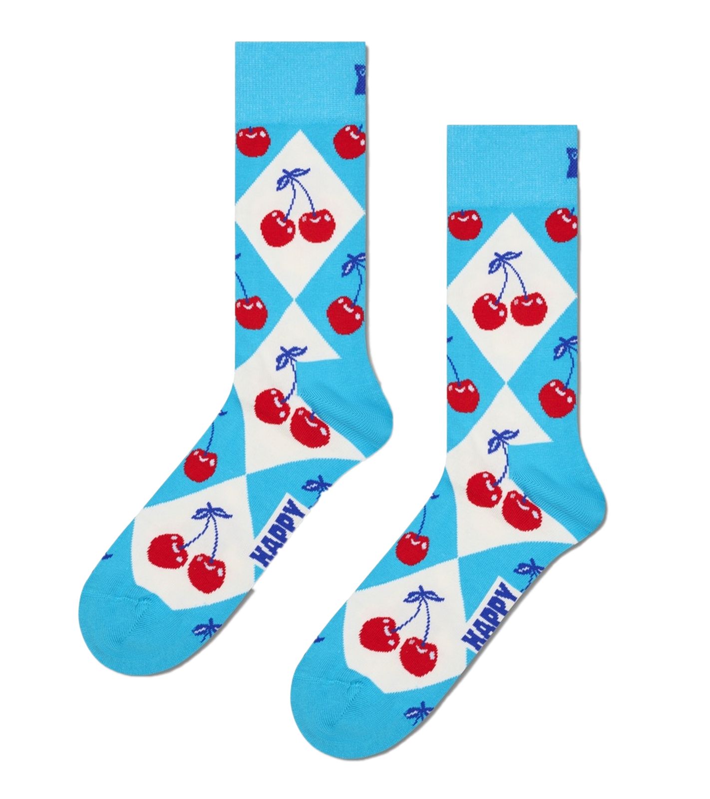 1 Paar Happy Socks Cherry Argyle Damen Socken mit Allover Kirschen-Print Baumwoll-Socken Alltags-Strümpfe P002570 Blau/Weiß/Rot