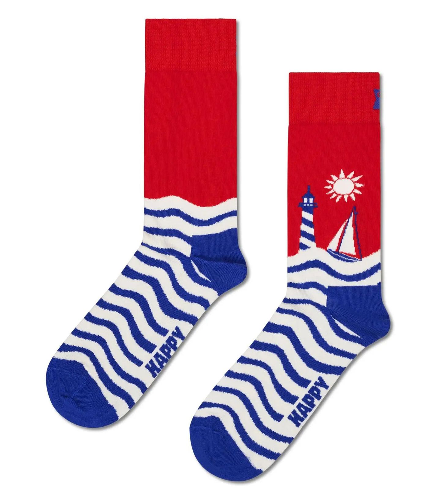 1 Paar Happy Socks Sail Away Unisex Socken Allover-Print mit See-Motiven Baumwoll-Socken Alltags-Strümpfe P002599 Rot/Blau/Weiß