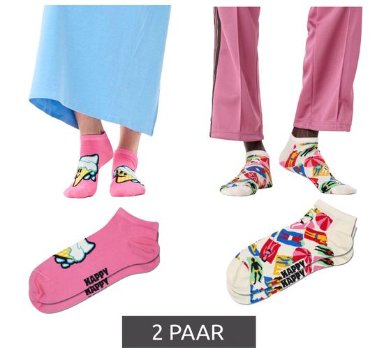 2 Paar Happy Socks Ice & Lazy Day Damen Sneaker-Socken mit Allover Eiscreme und Strand-Print Low-Cut Socken Alltags-Strümpfe P002633 Weiß/Rosa/Bunt