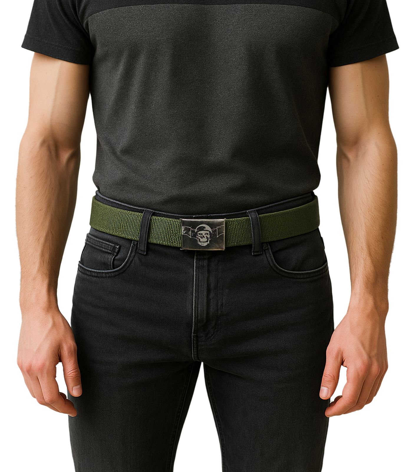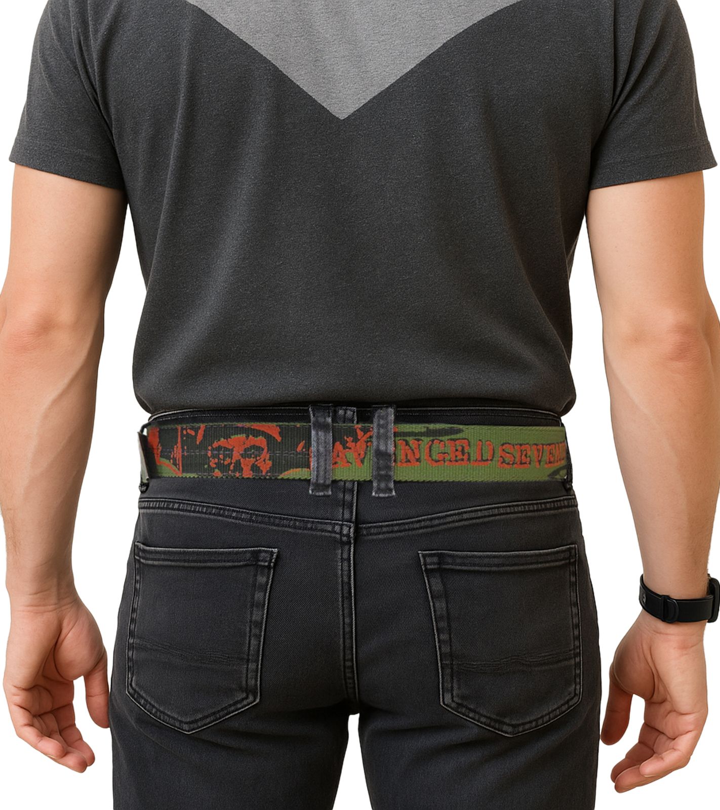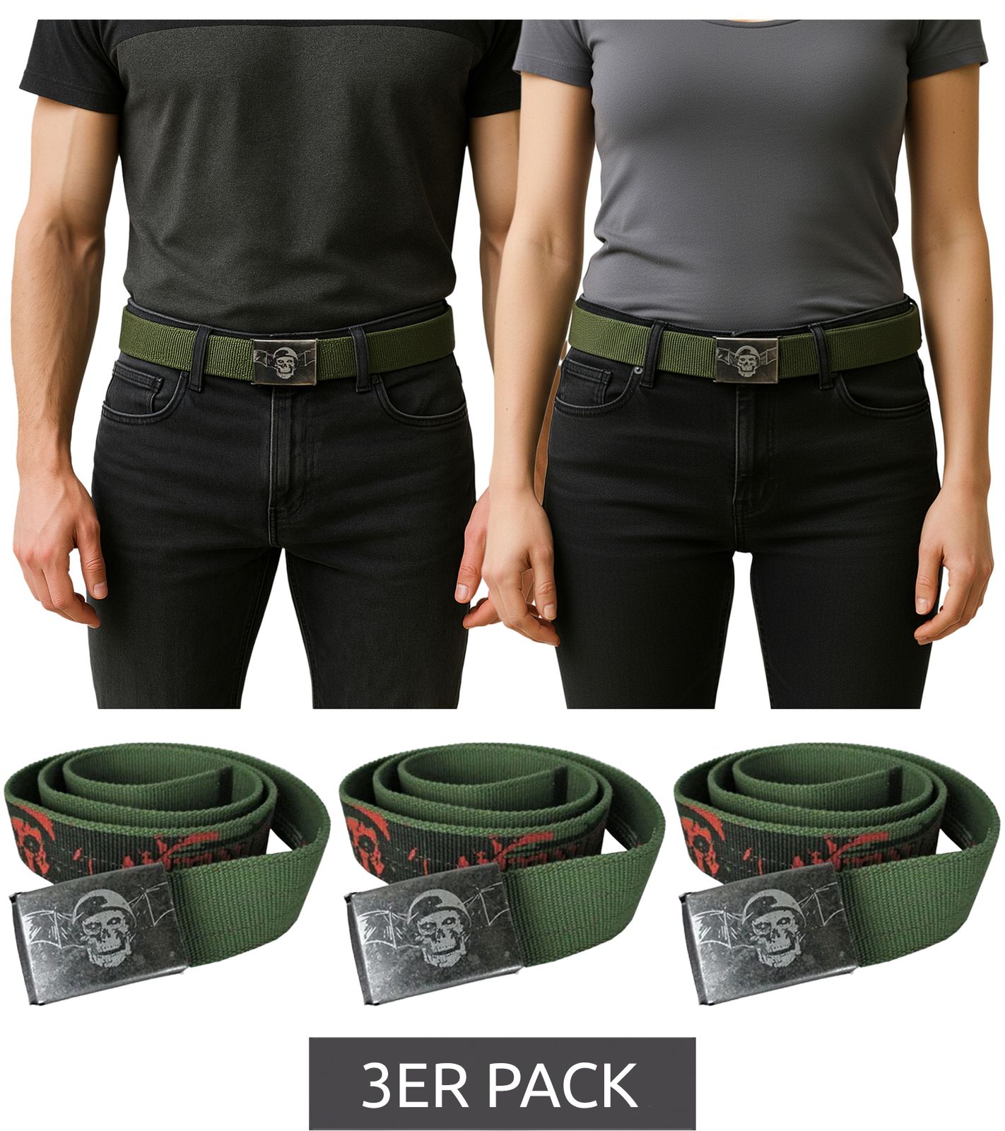 3er Pack Avenged Sevenfold A7X Gürtel von der Metal-Band Stoff-Gürtel Totenkopf mit Stahlhelm und Fledermausflügel Alltags-Gürtel für Damen und Herren ca. 126cm mit Band-Schriftzug BT111786ASF0 Oliv-Grün
