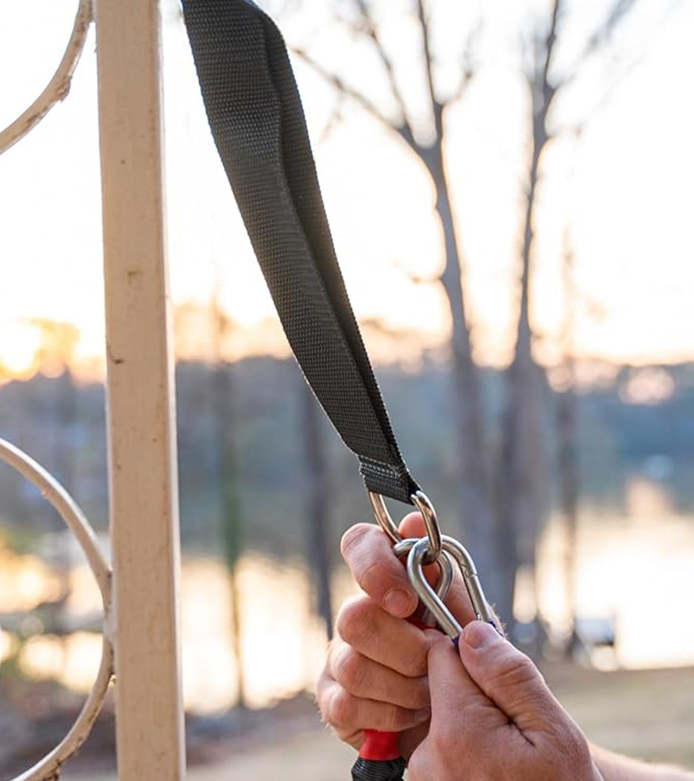 - Am Ende jedes Bandes befindet sich ein stabiler Metallring. Dieser ermöglicht eine schnelle und sichere Befestigung an verschiedenen Ankerpunkten