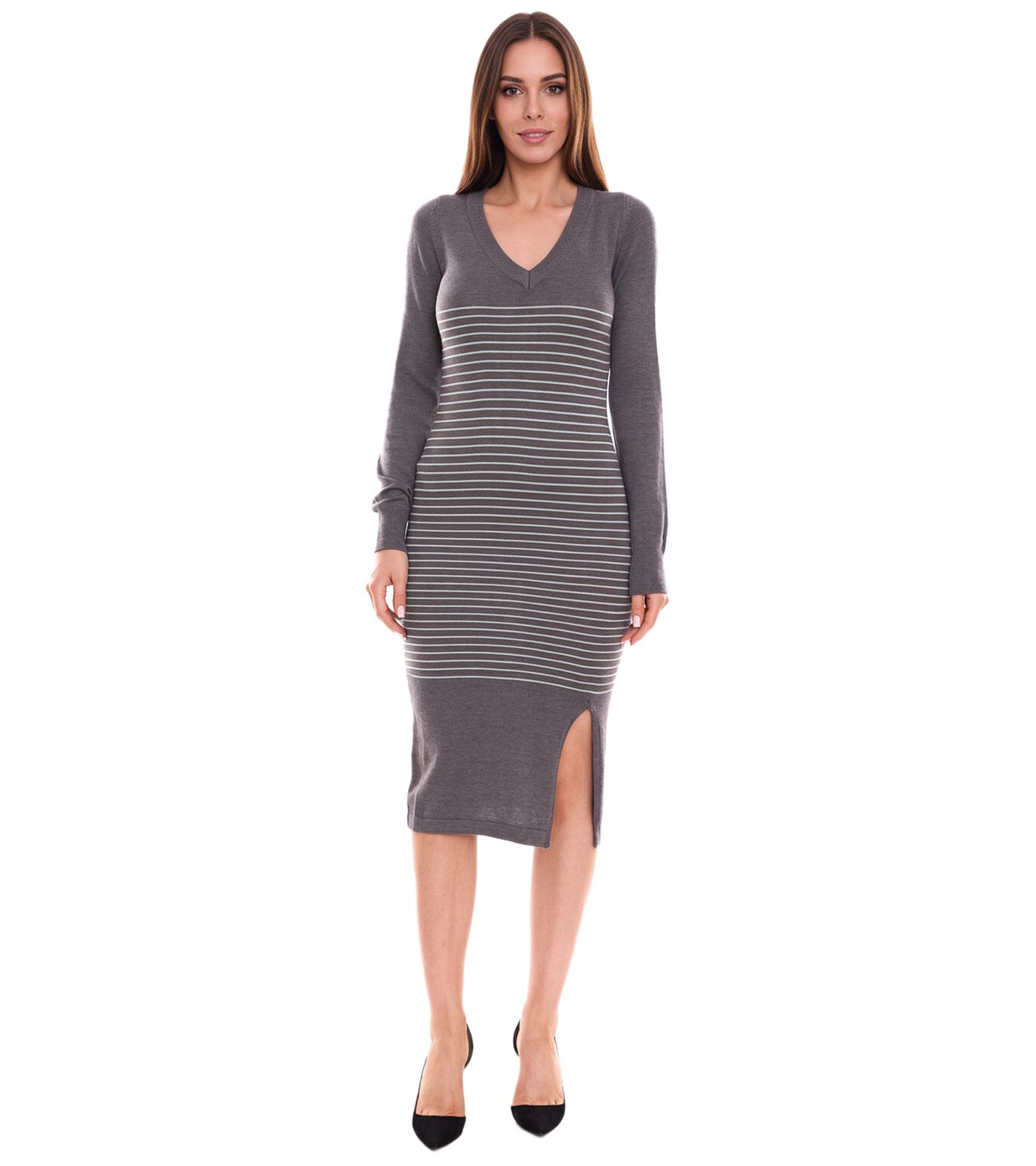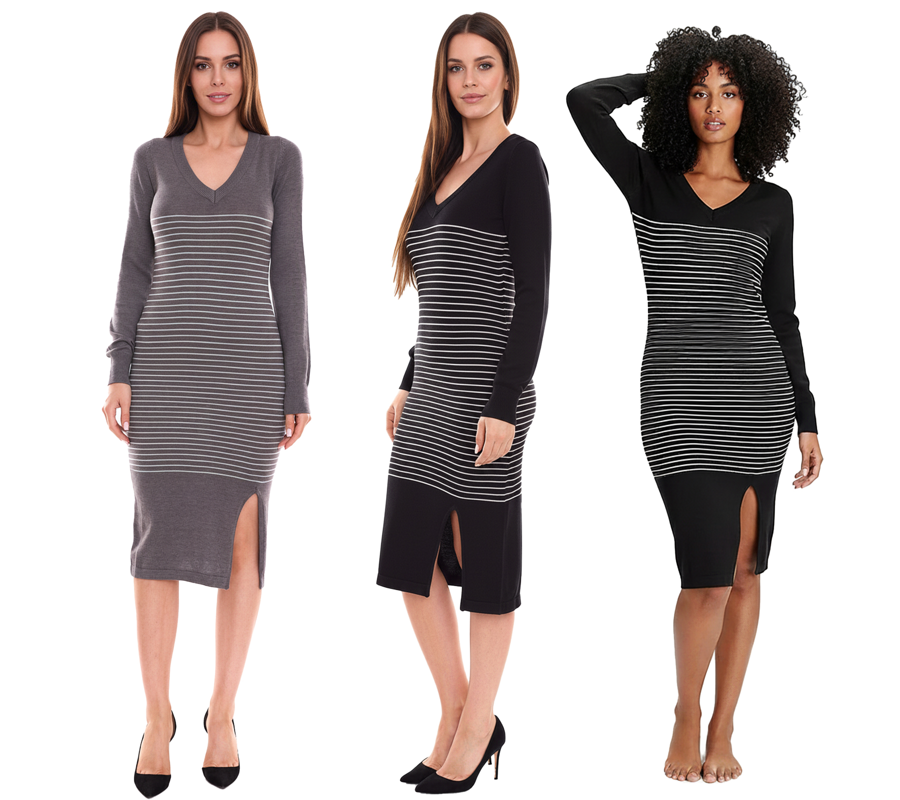 AjC Damen Pullover-Kleid gestreift Midi-Kleid Strick-Kleid in Grau, Schwarz oder Blau