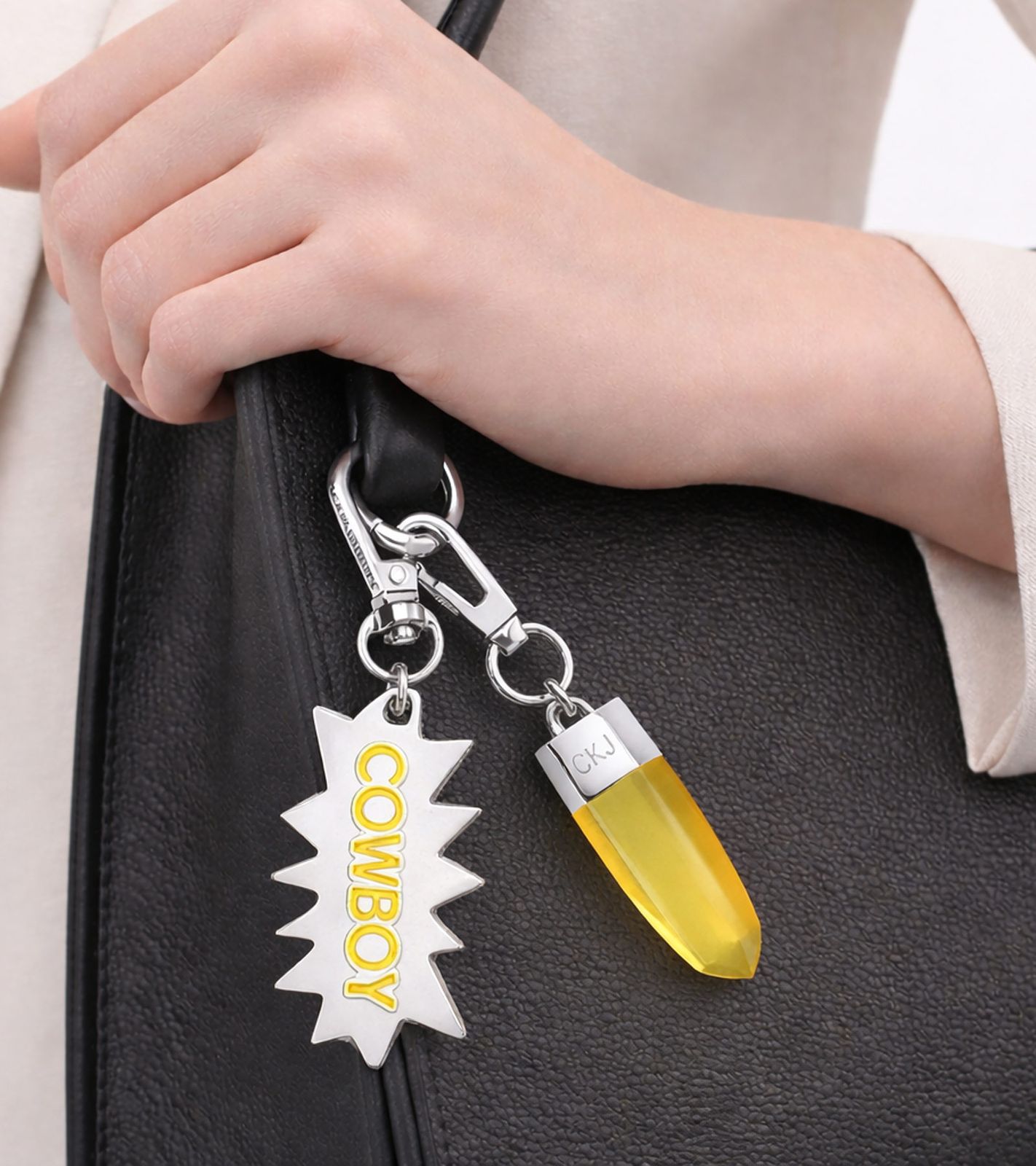 Cooles Calvin Klein Charm-Set Downtown Edelstahl-Anhänger mit kontrastfarbigen Harz und COWBOY-Schriftzug Taschen-Accessoires 7x1,3cm KJJCJA090200 Silber/Gelb