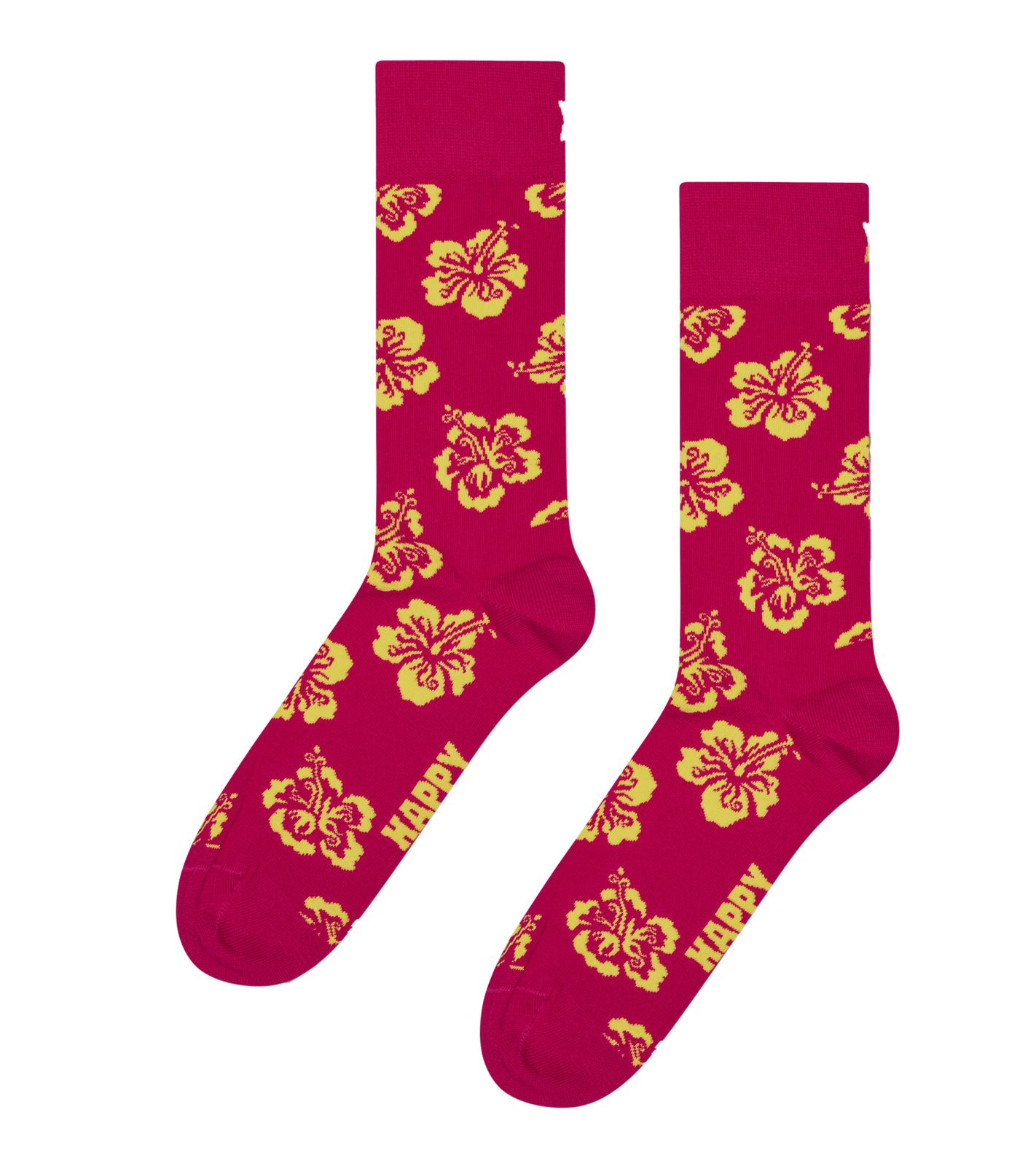 1 Pair of Happy Socks Hibiscus Women's Socks with Hibiscus Print, Cotton Socks, Everyday Socks, P0026109 Pink/Yellow