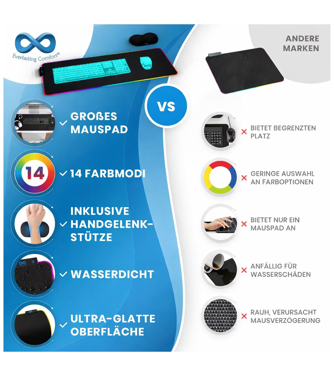 2-Pack Everlasting Comfort RGB Mouse Pad Gaming Mat with LED Lighting, Wrist Rest, and Color-Changing Modes, Large Mouse Pad 80x30cm, Gaming Accessory, Black