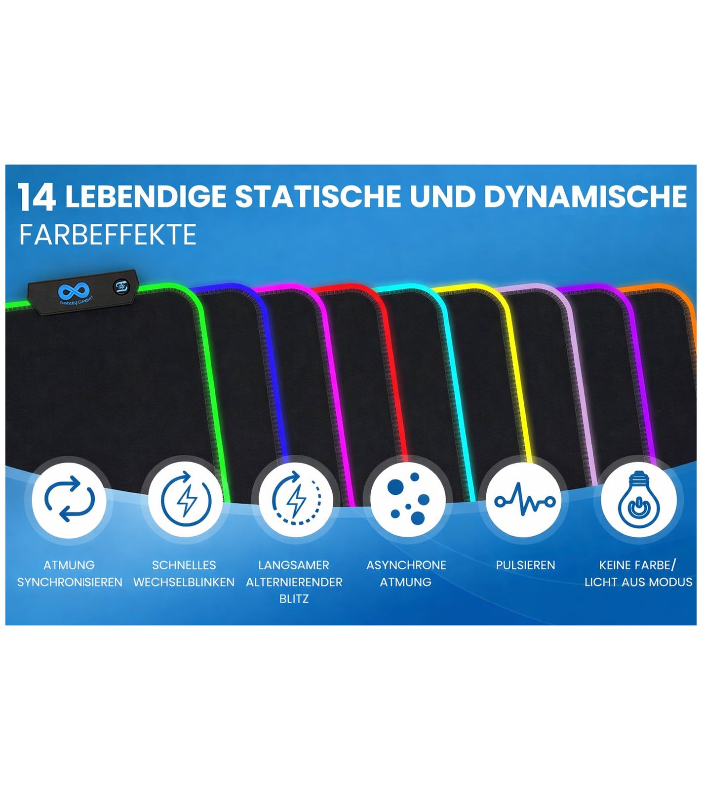 This gaming accessory offers 9 static color modes and 5 dynamic color-changing modes (14 color effects) with adjustable brightness.