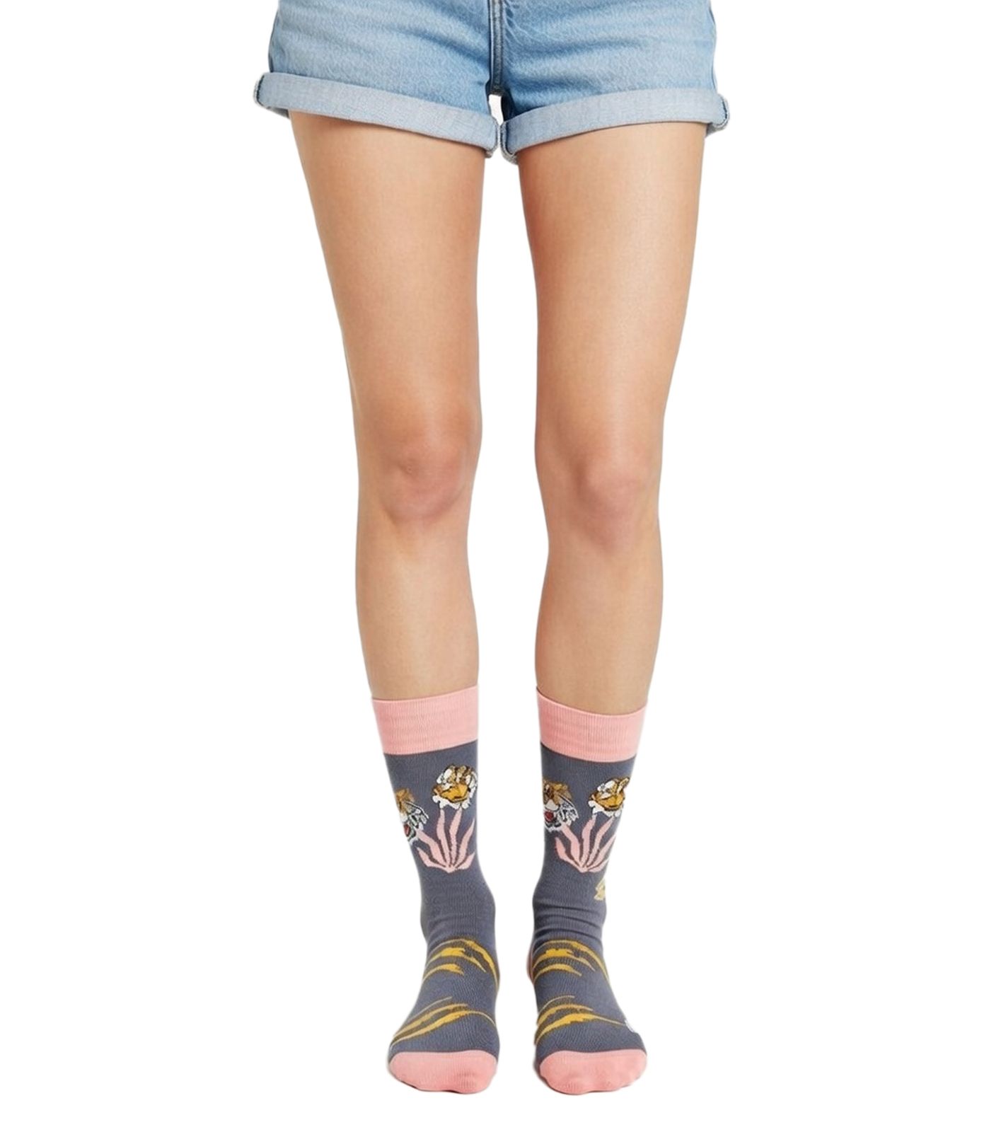 6 pairs of Moustard cotton socks with animal, floral and retro prints, patterned long socks, gray/green/blue/pink/yellow