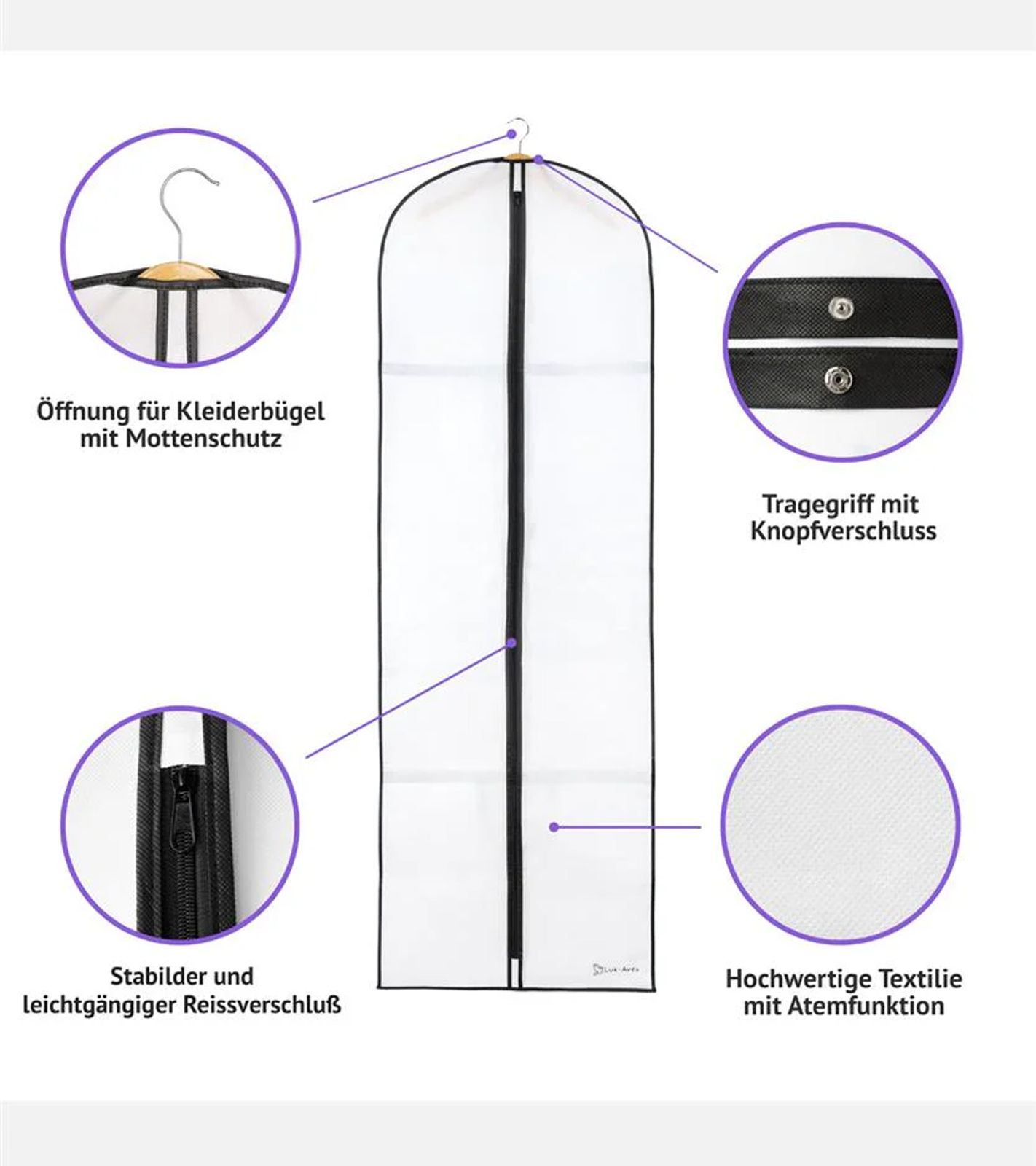 Perfect protection against dust, dirt, and moisture. Ideal for suits, dresses, jackets, and delicate fabrics.