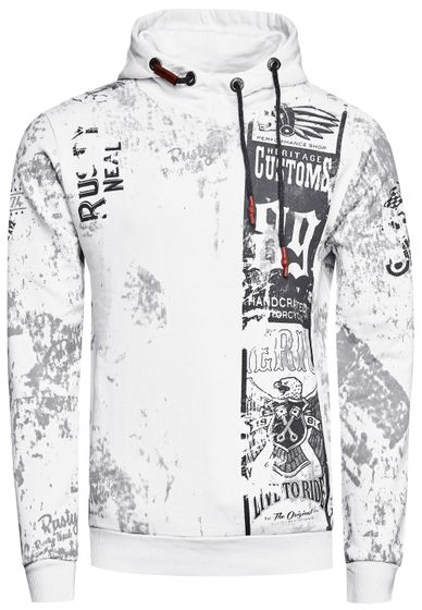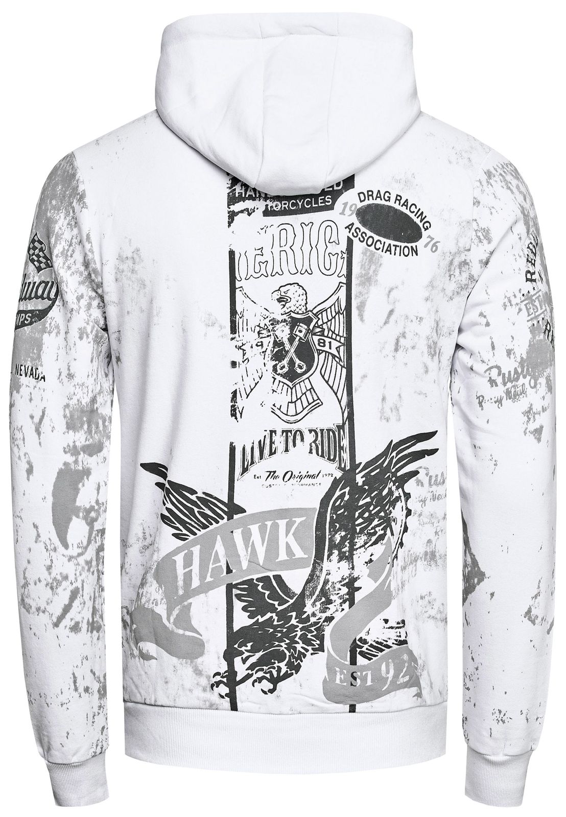 Casual men's hoodie with biker prints and vintage wash, hooded pullover sweatshirt 19137 white
