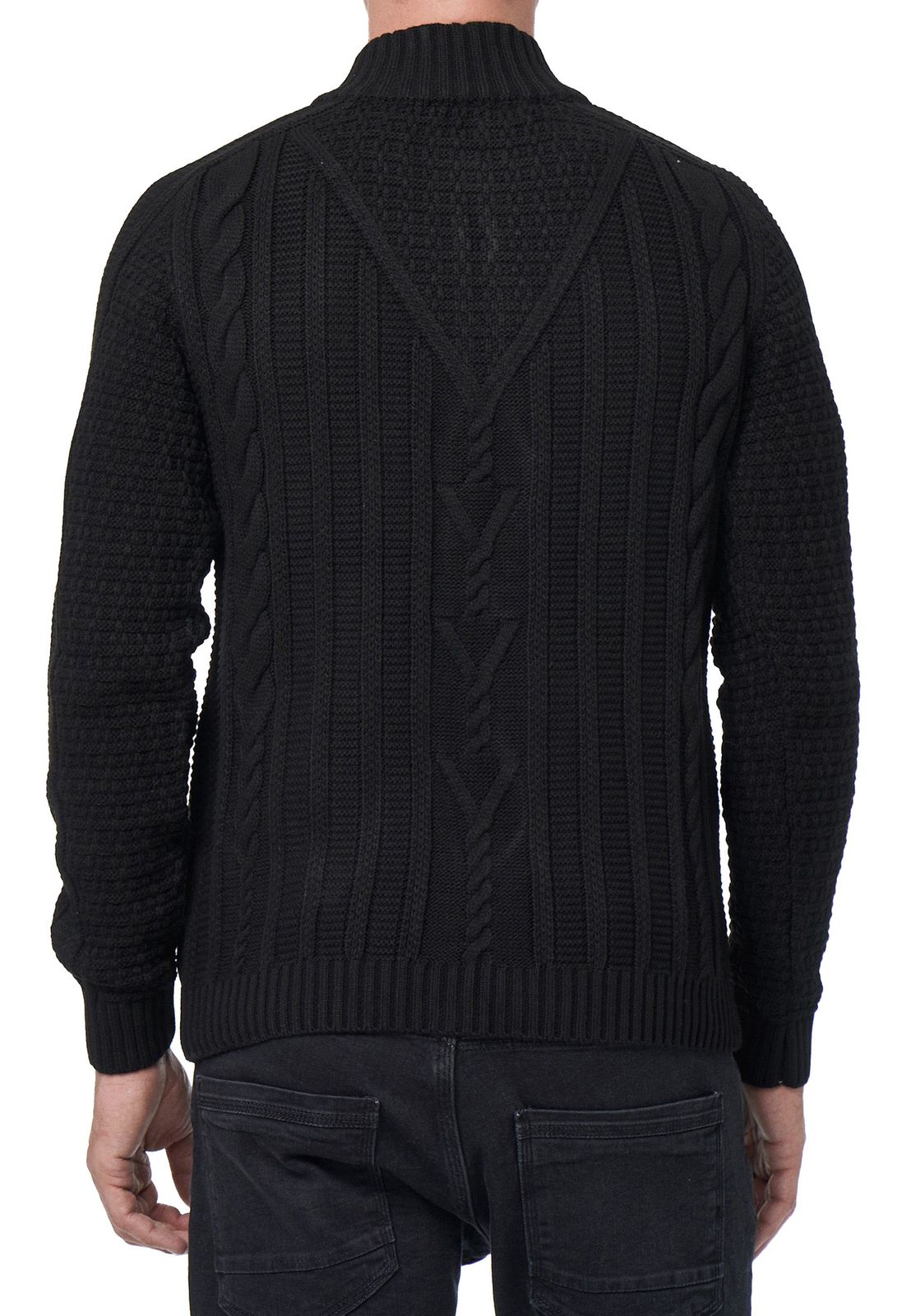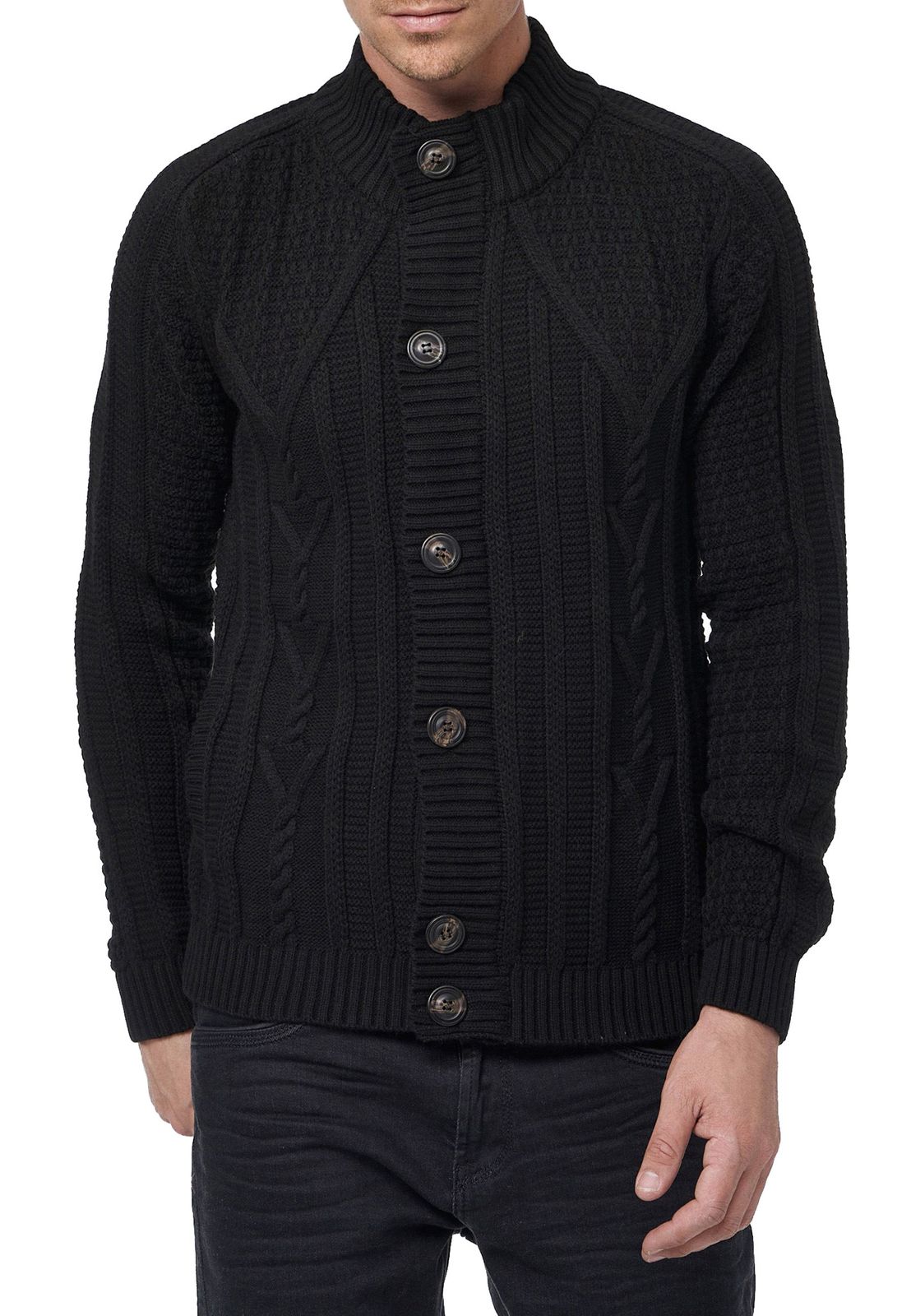 Classic men's chunky knit cardigan with stand-up collar and button placket, textured cardigan 13401 Black