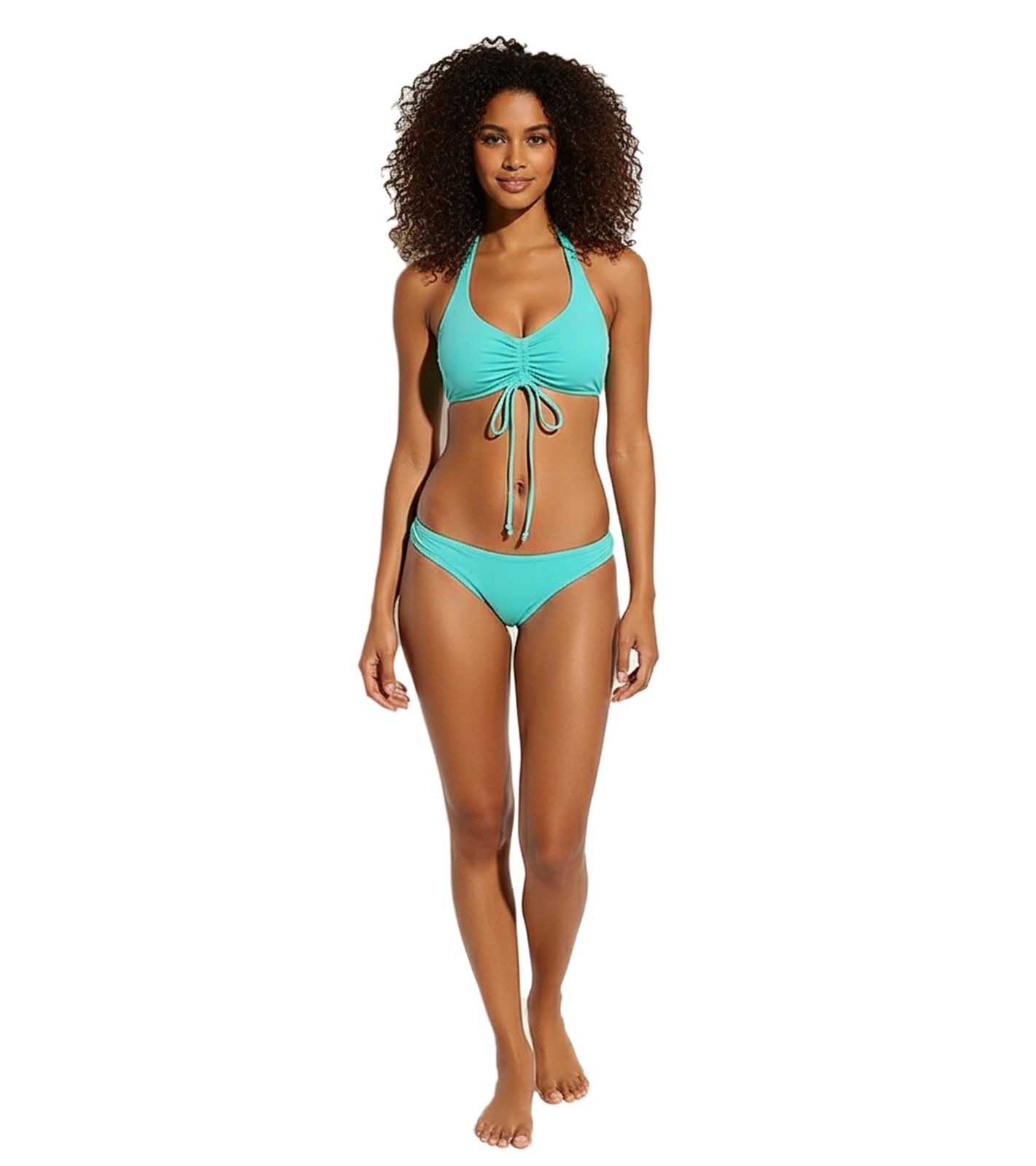Bikini top with a deep V-neck and halter straps, ruching between the cups, and matching bottoms.