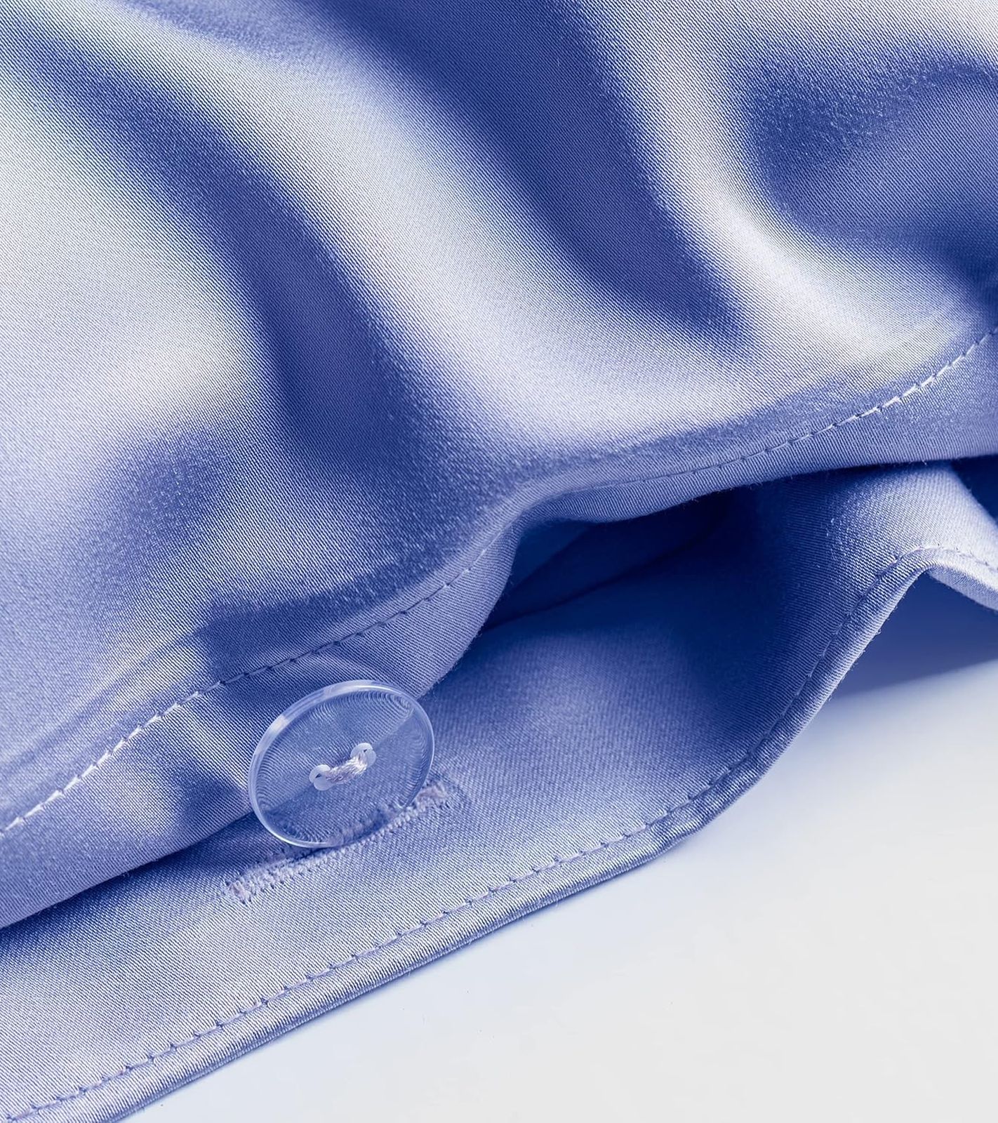 The duvet cover has a button closure, while the pillowcase has a zipper for added convenience
