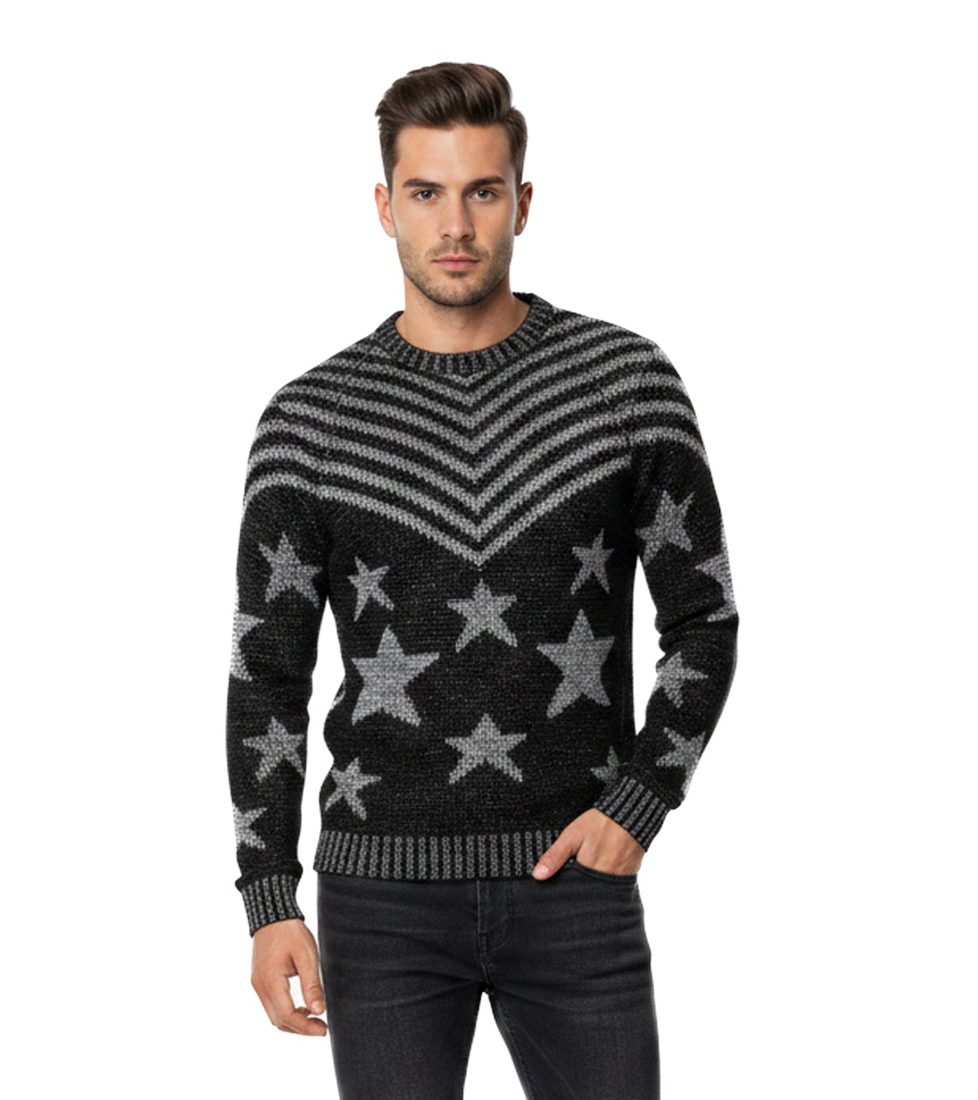 Fashionable men's crew neck sweater in "USA Stars & Stripes" design, knit sweater 6263, black