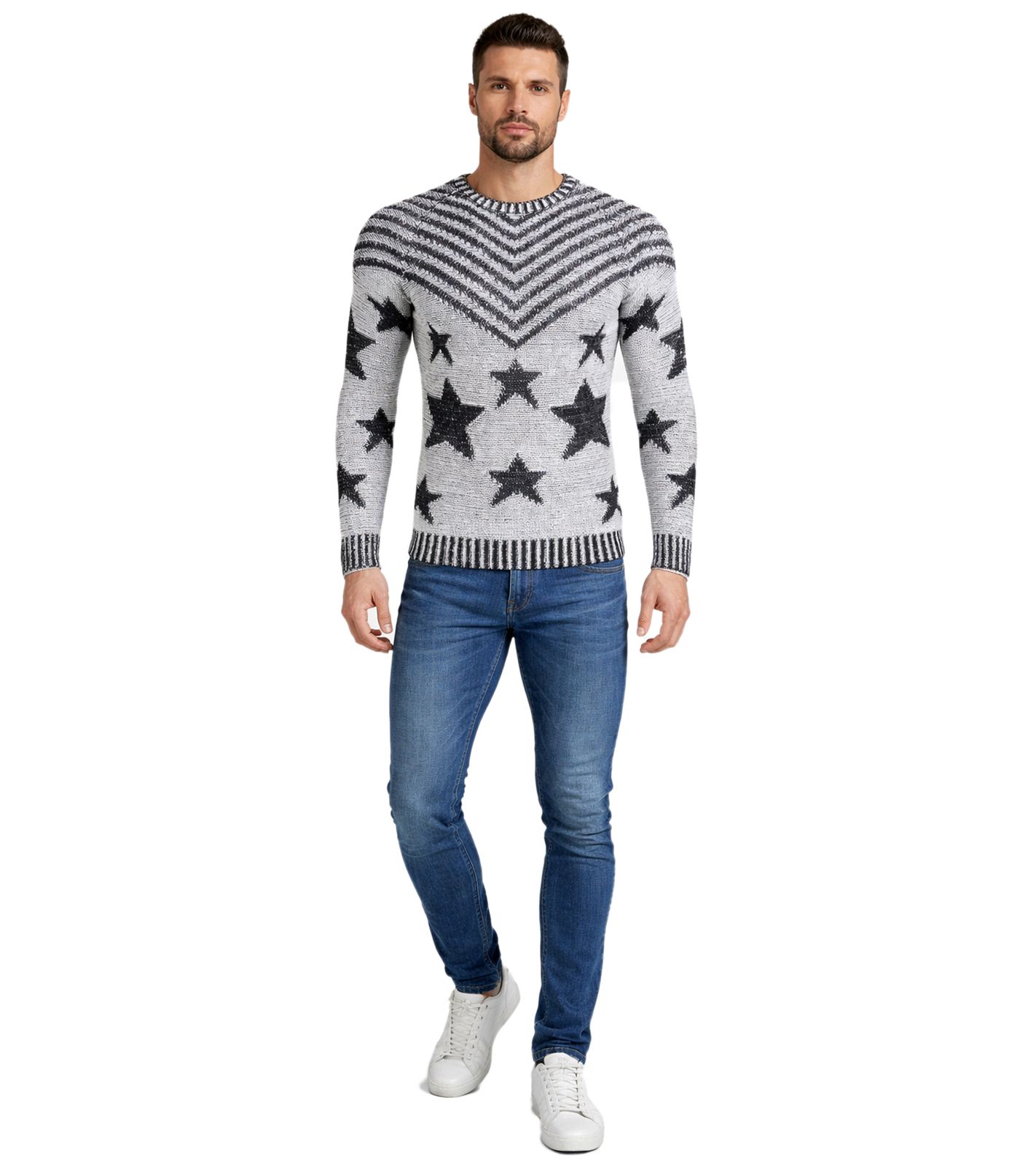 Fashionable men's crew neck sweater in "USA Stars & Stripes" design, knitted sweater 6263 Grey
