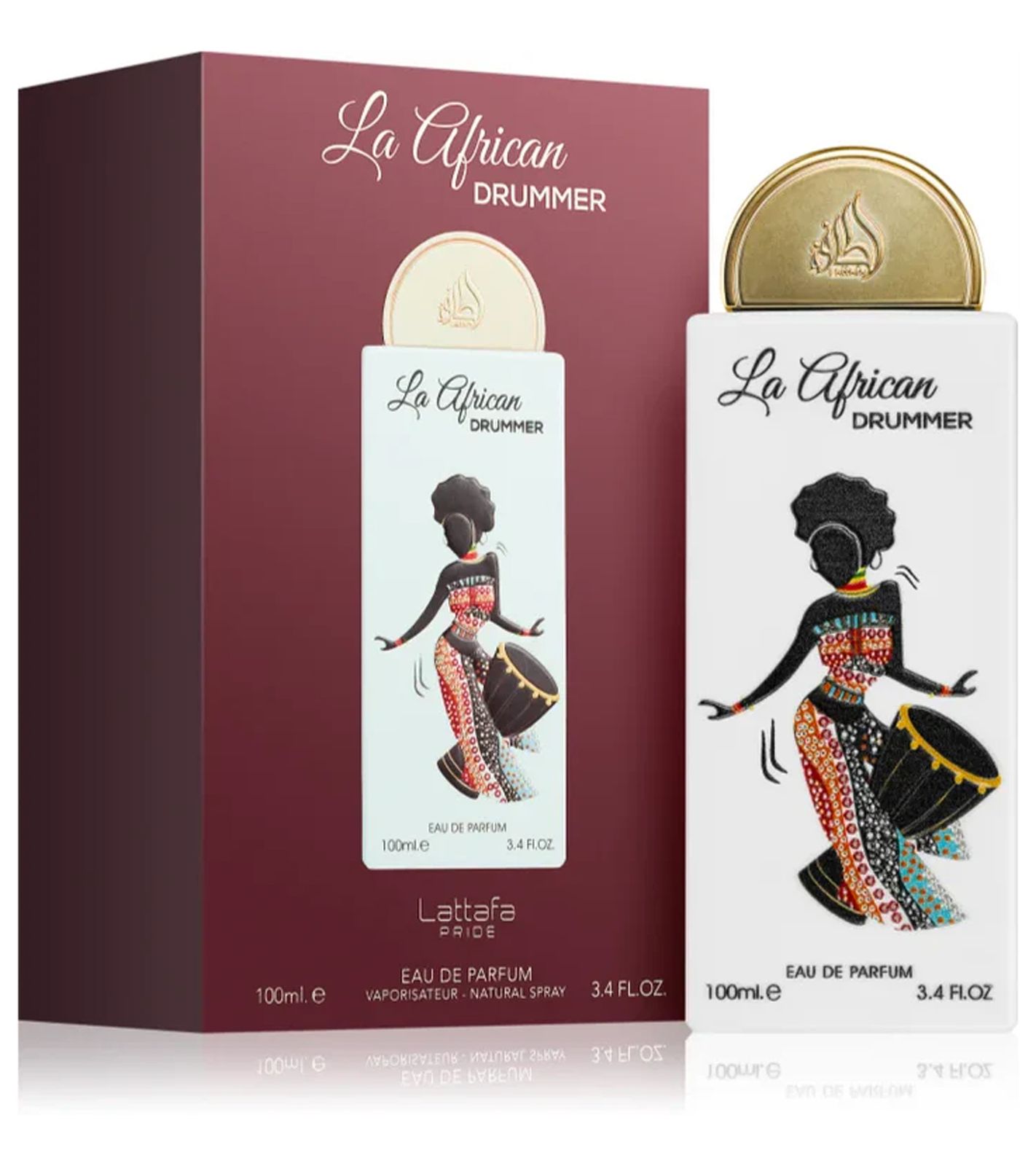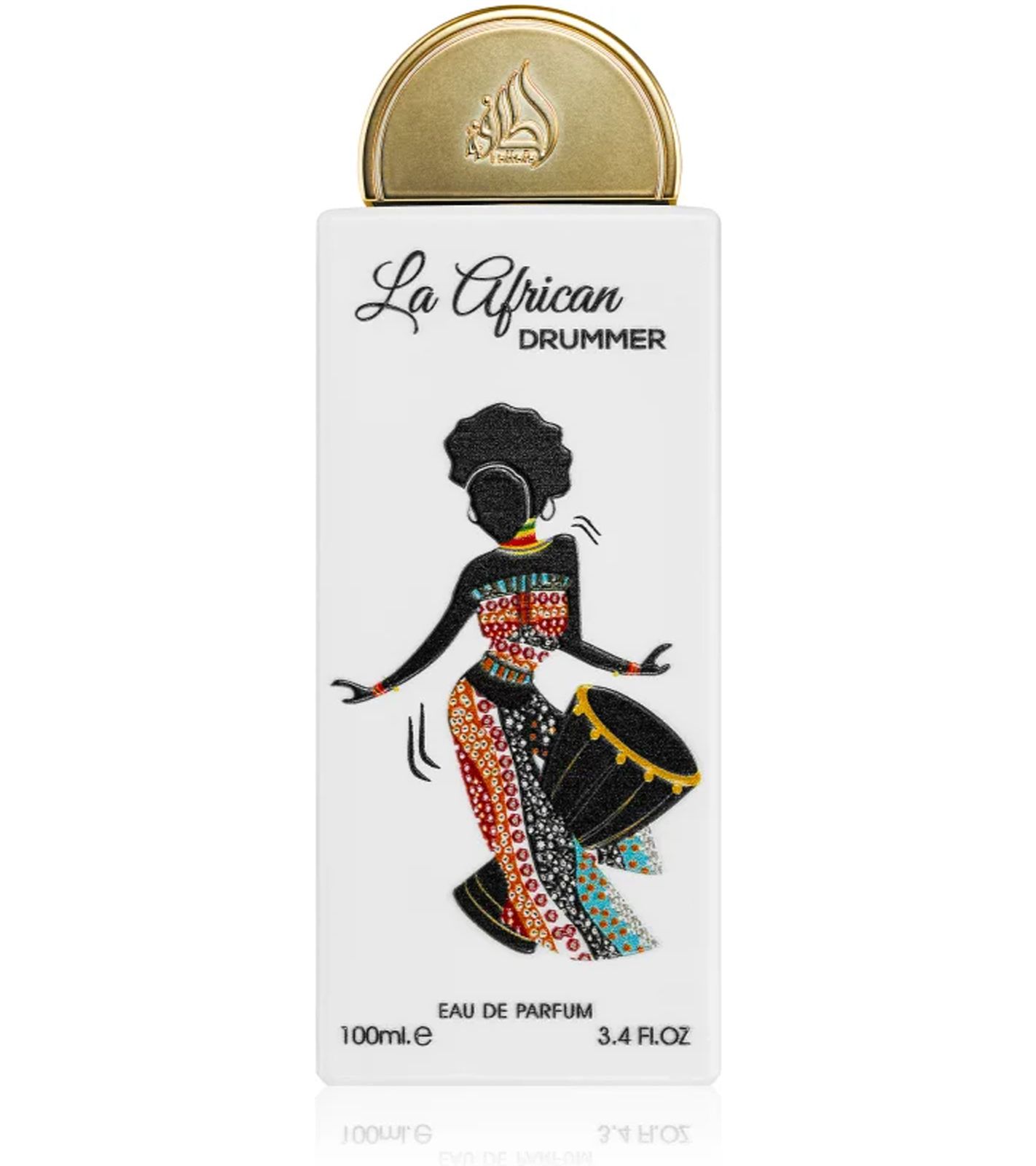 Lattafa La African Drummer Eau de Parfum, a fruity-fresh body perfume with a warm, oriental aura, in 100ml white.