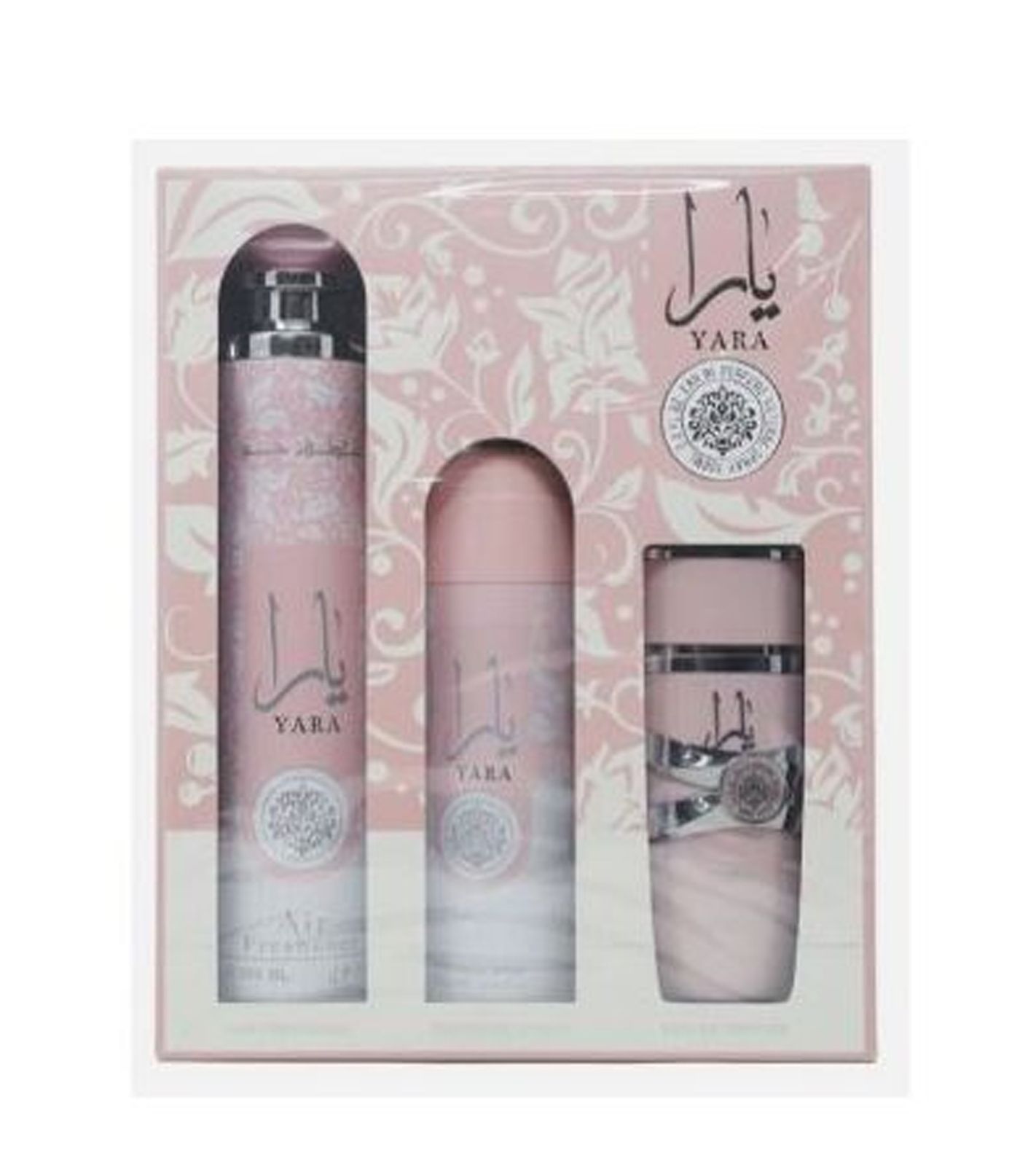 Contents: 1 x Lattafa Yara Air Freshener / Room Fragrance (300 ml), 1 x Lattafa Yara Perfumed Spray / Body Spray (200 ml), and 1 x Lattafa Yara Eau de Parfum (100 ml)