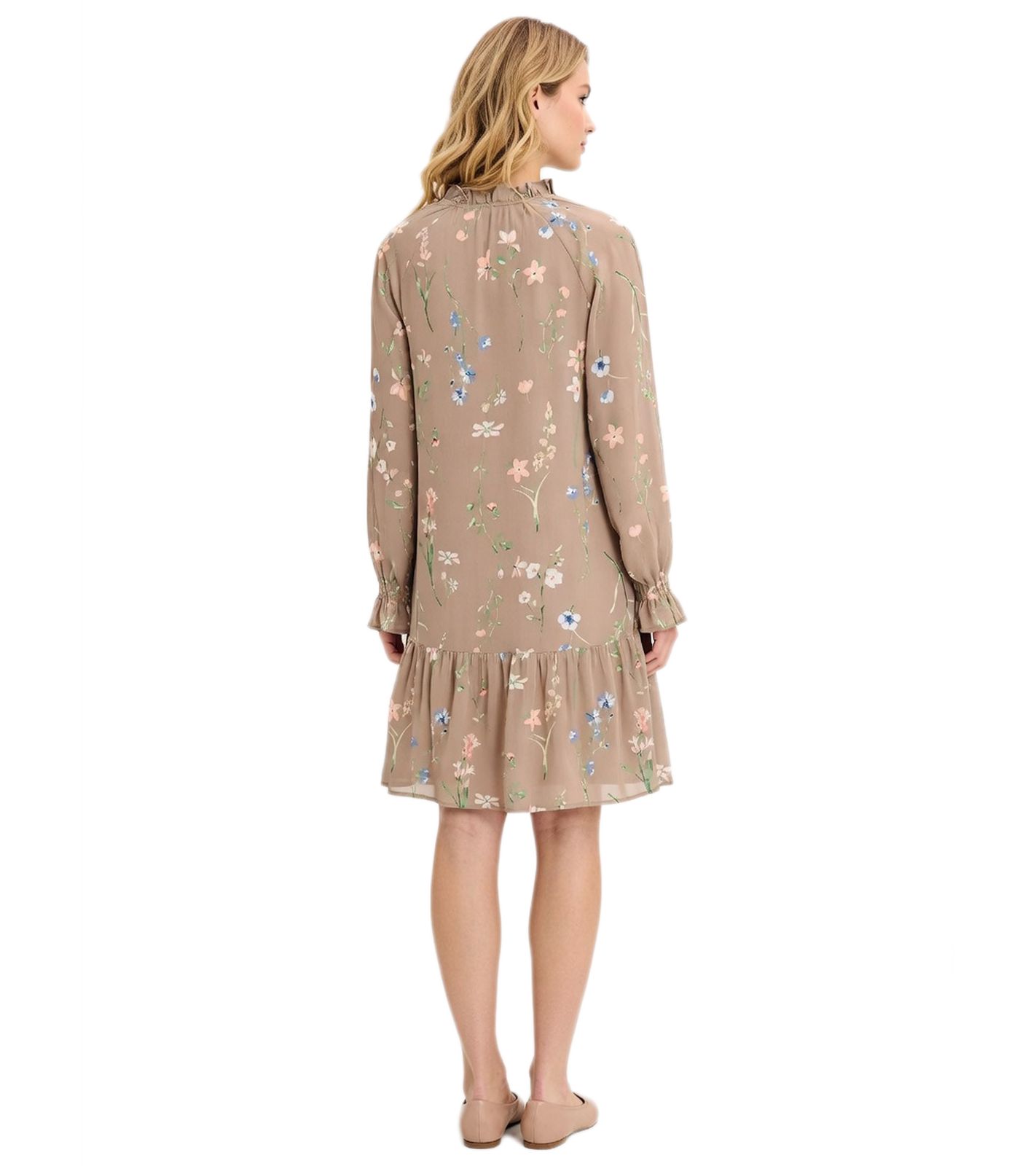 With flounces and ruffles at the neckline