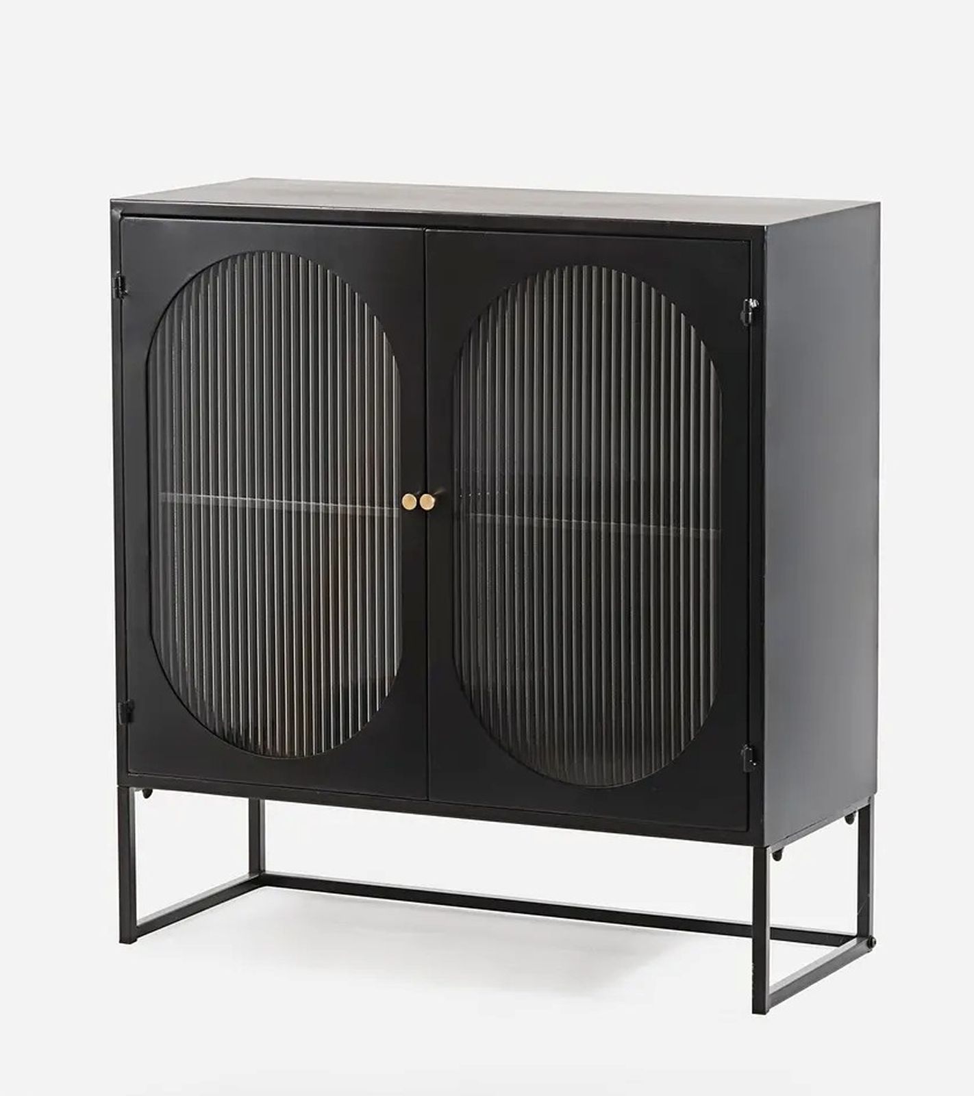 The clean black finish and elegant, ribbed glass doors give the cabinet a contemporary aesthetic, while the gold knobs add a touch of sophistication.