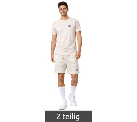 Stylish 2-piece summer set in beige with front and back prints. High-quality cotton T-shirt combined with comfortable jersey shorts—perfect for everyday wear and streetwear.