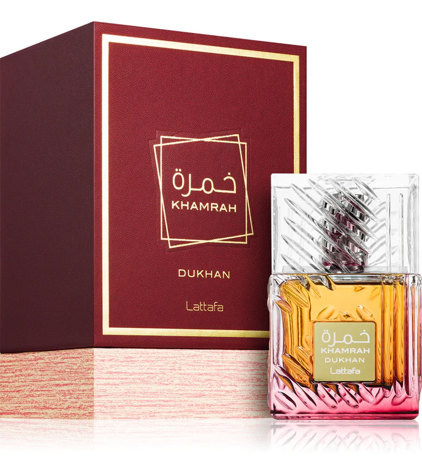 Oriental-spicy Lattafa Khamrah Dukhan unisex perfume in an elegant bottle – Eau de Parfum 100 ml Smoke Brown & Gold
