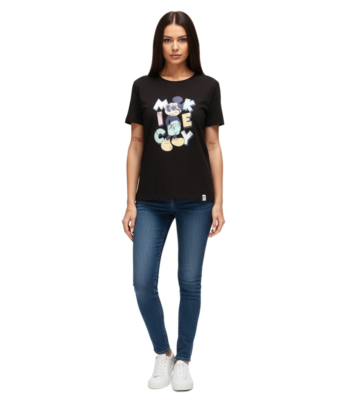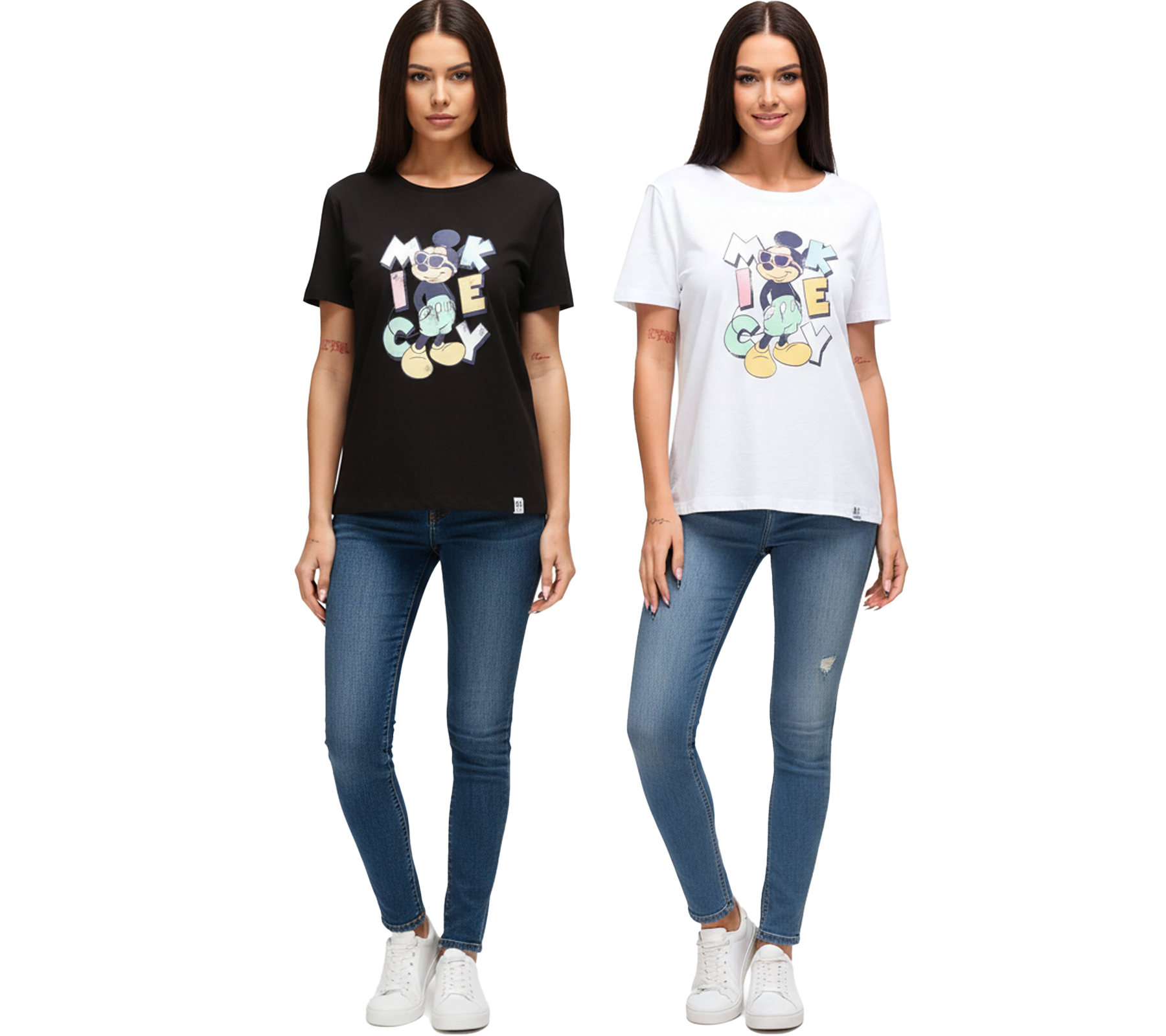 RE:COVERED X Disney Women's Sustainable T-Shirt with Mickey Mouse Print in Pastel Colors. Cotton T-Shirt, Crew Neck, RCDIF207, White or Black
