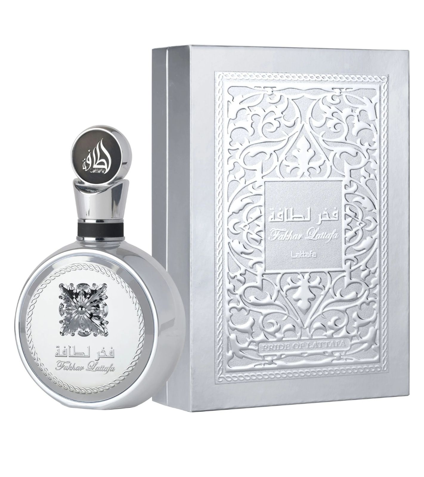 Refined Lattafa Fakhar Platinum Unisex Eau de Parfum, a sensual oriental body fragrance for women and men, 100ml, silver bottle