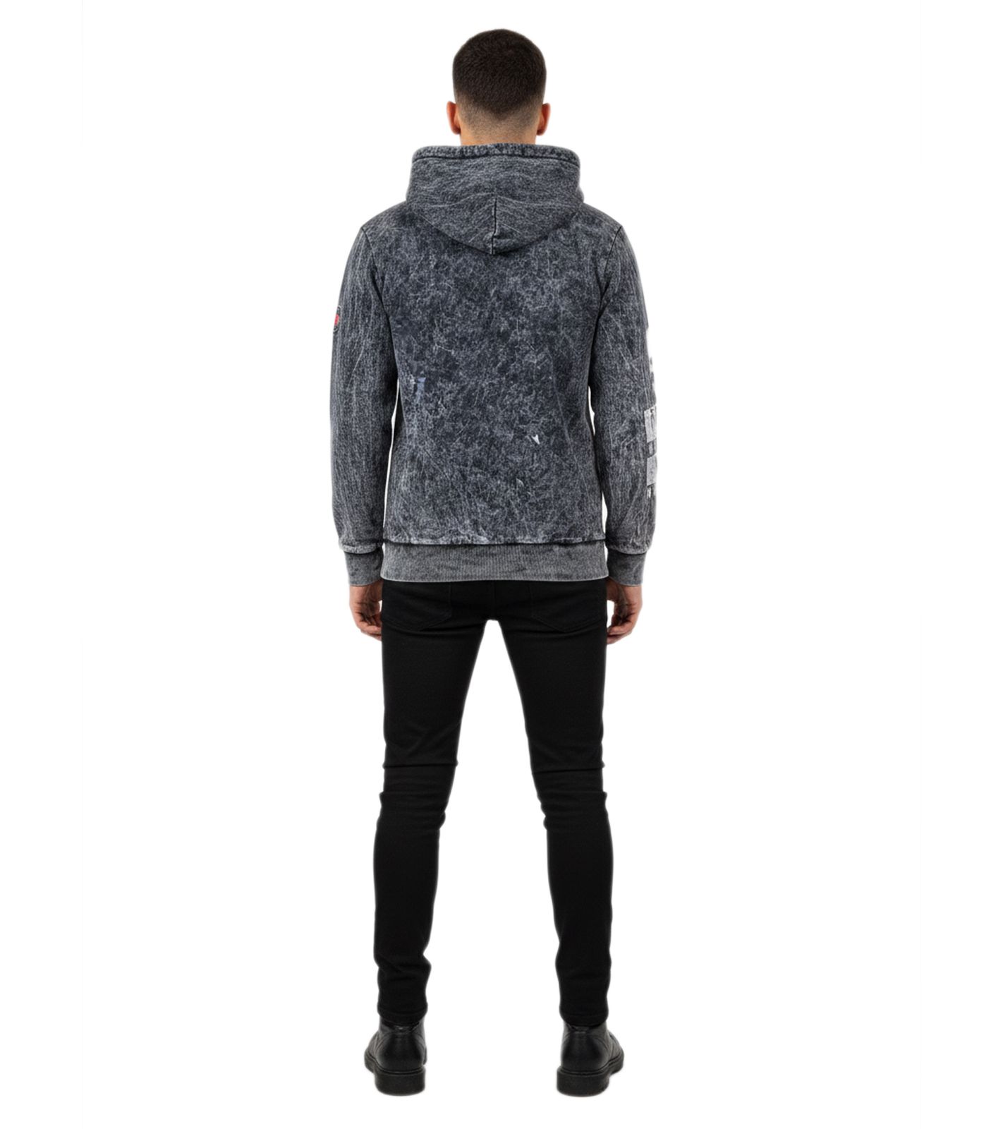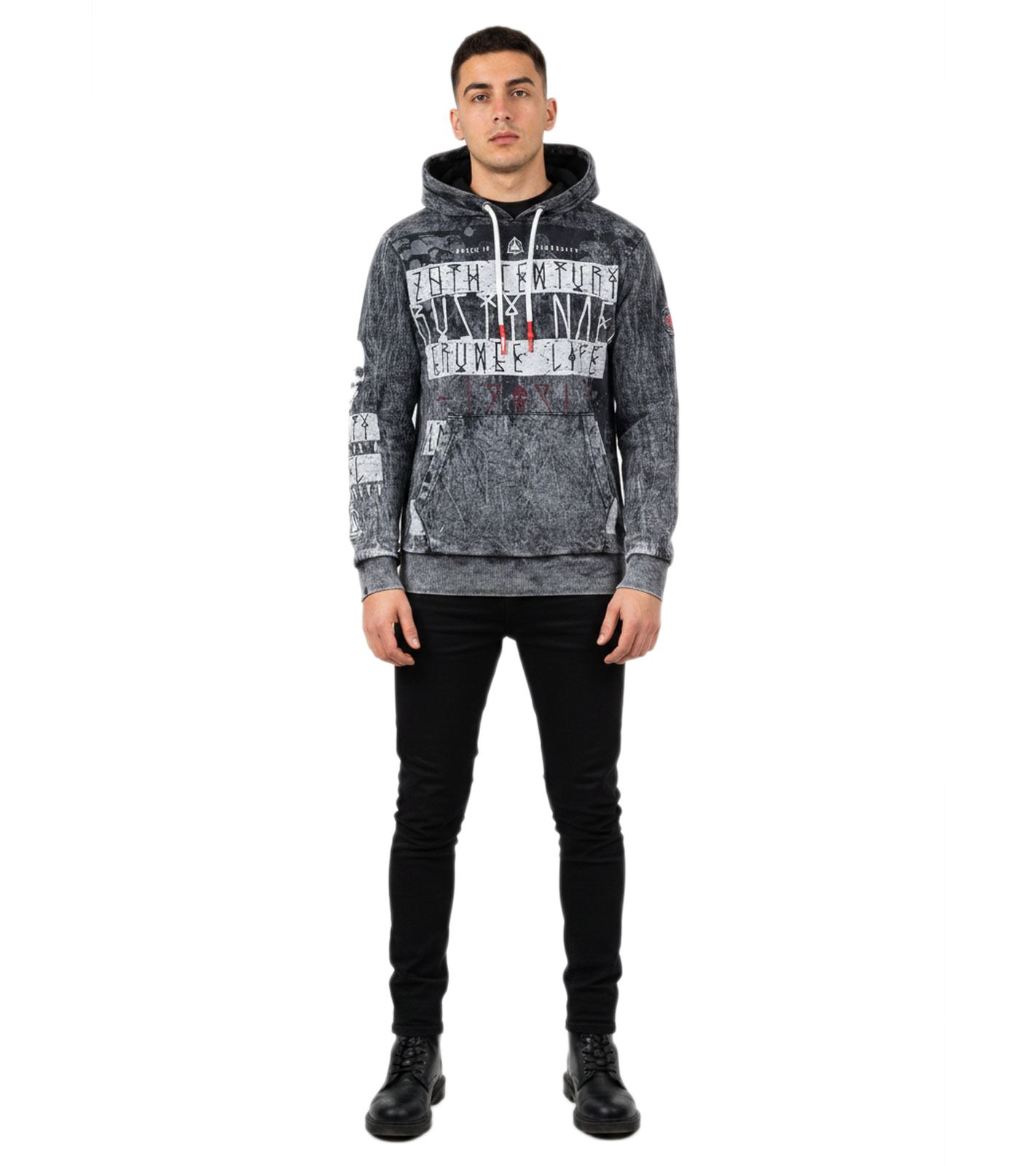 Stylish Men's Vintage-Washed Hoodie with Grunge Print Sweatshirt 19124 Black