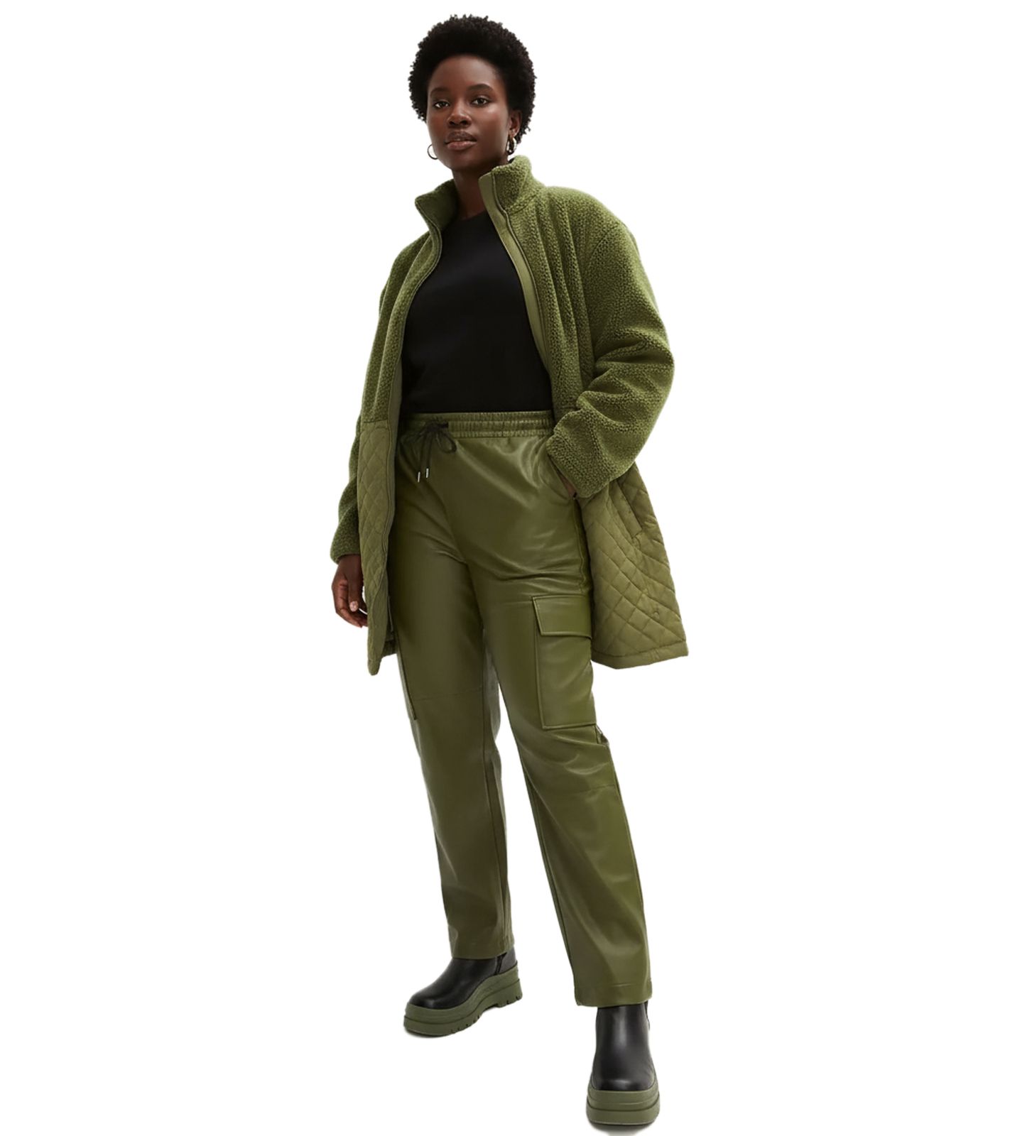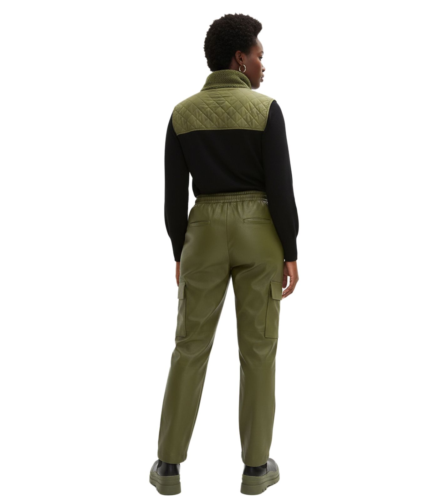 Trendy women's faux leather trousers with elastic waistband, casual trousers 914386, dark khaki