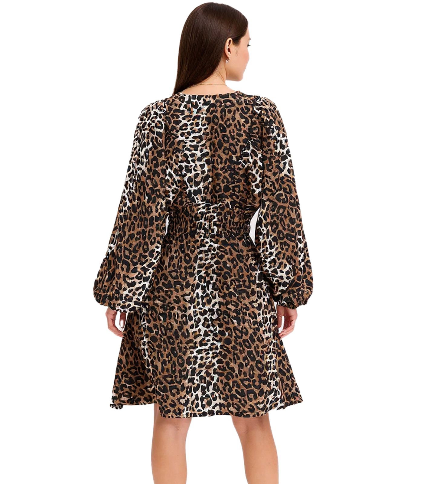 Fashionable animal print dress with a defined waist and voluminous sleeves