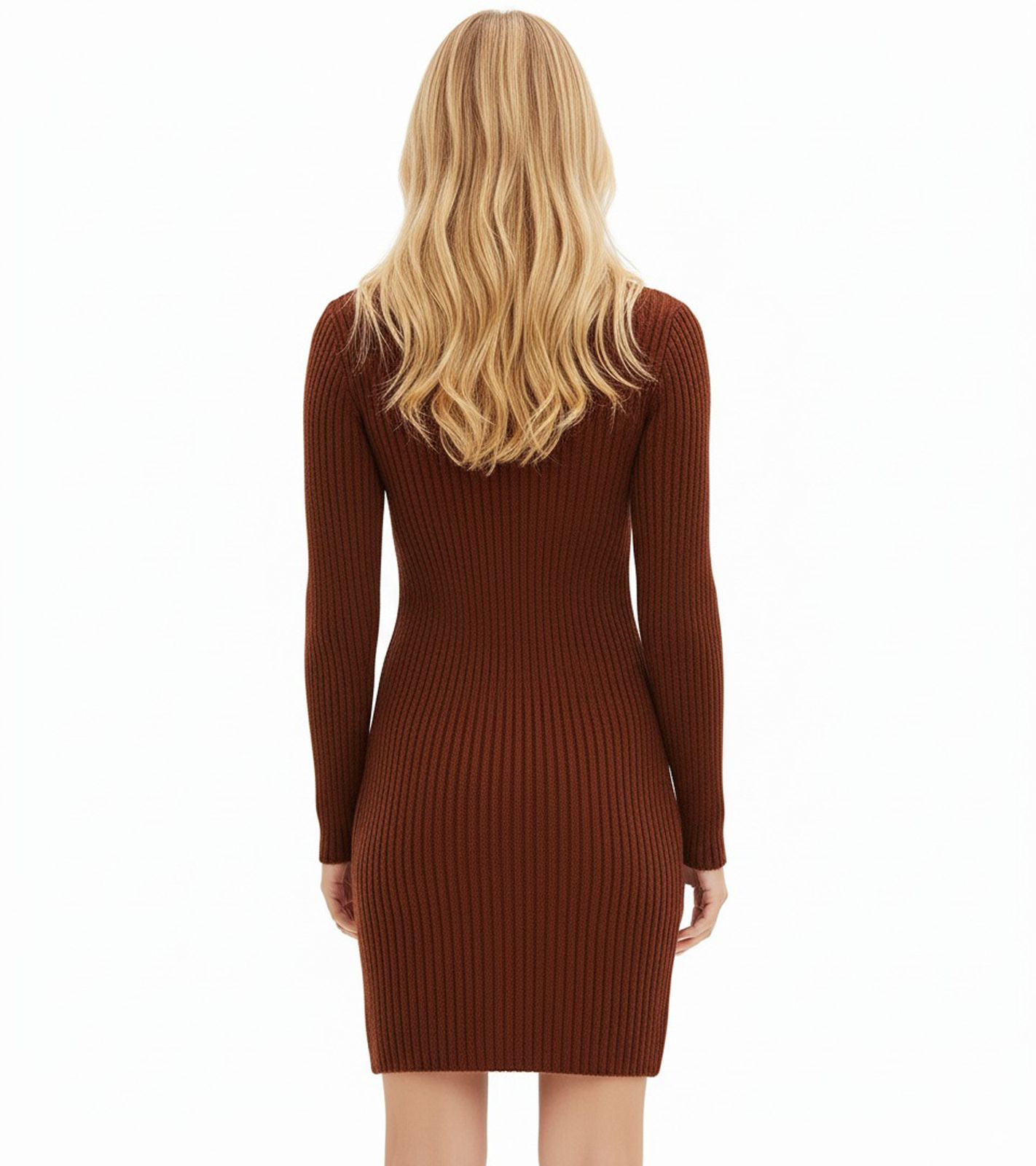 Women's Knit Mini Dress with Turtleneck and Neckline Details, Long Sleeve, Mahogany Brown or Dark Blue