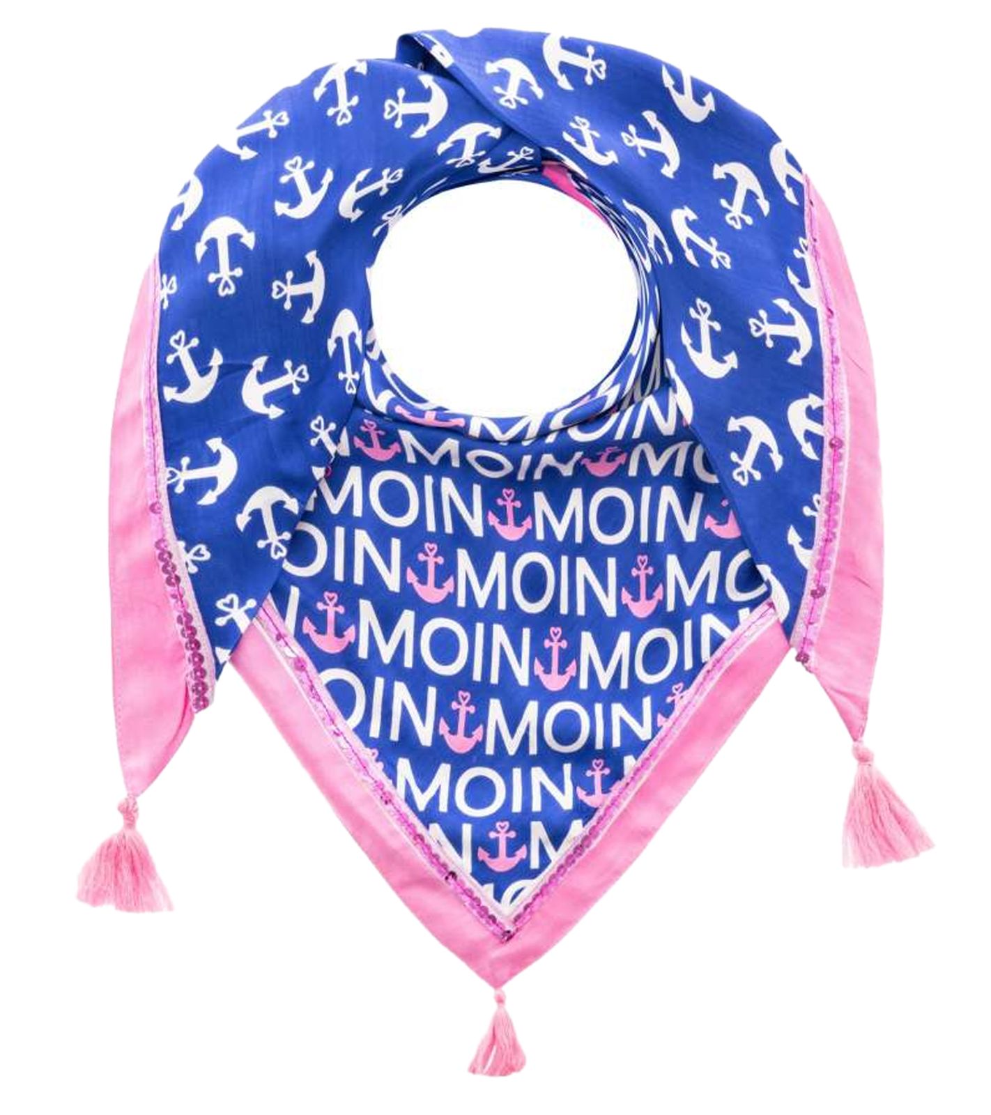 ZWILLINGSHERZ Heart Anchor Triangular Scarf in a Maritime Design with Moin Moin Lettering, Fashion Scarf 3014D-0703-89 Blue/Pink/White