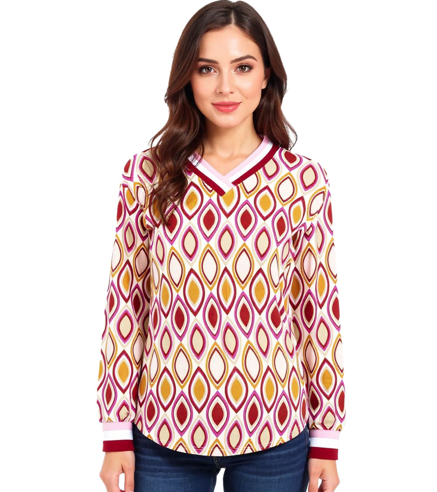 ZWILLINGSHERZ Ornament Women's Long-Sleeved Summer Shirt in Retro Style 31627 Beige/Pink/Red or Beige/Pink/Orange/Blue