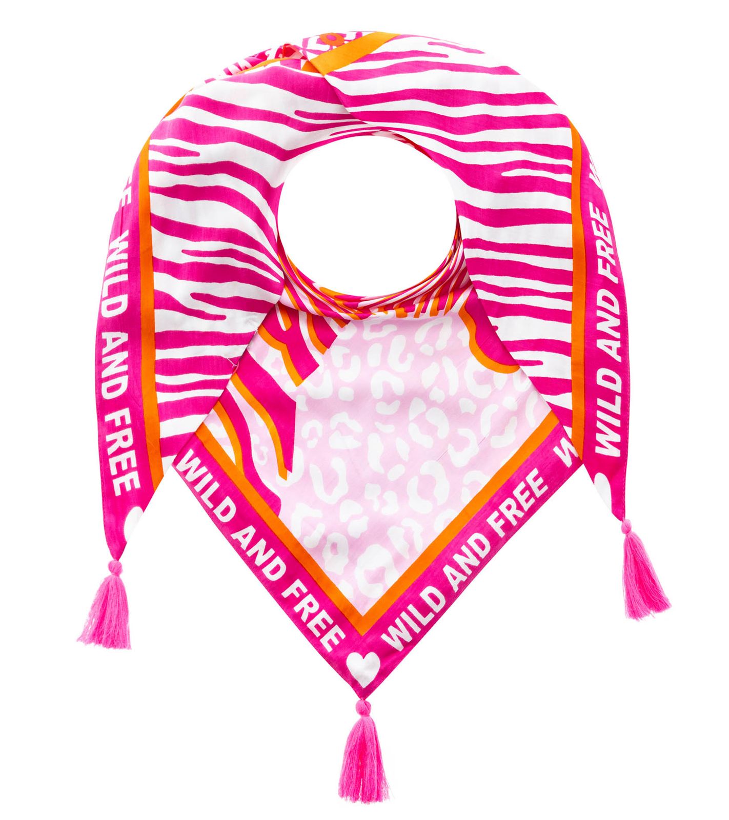 ZWILLINGSHERZ Wild Zebra Triangular Scarf with Animal Print and Statement Lettering, Fashion Scarf 3014D-0204-22 Pink/Orange/White