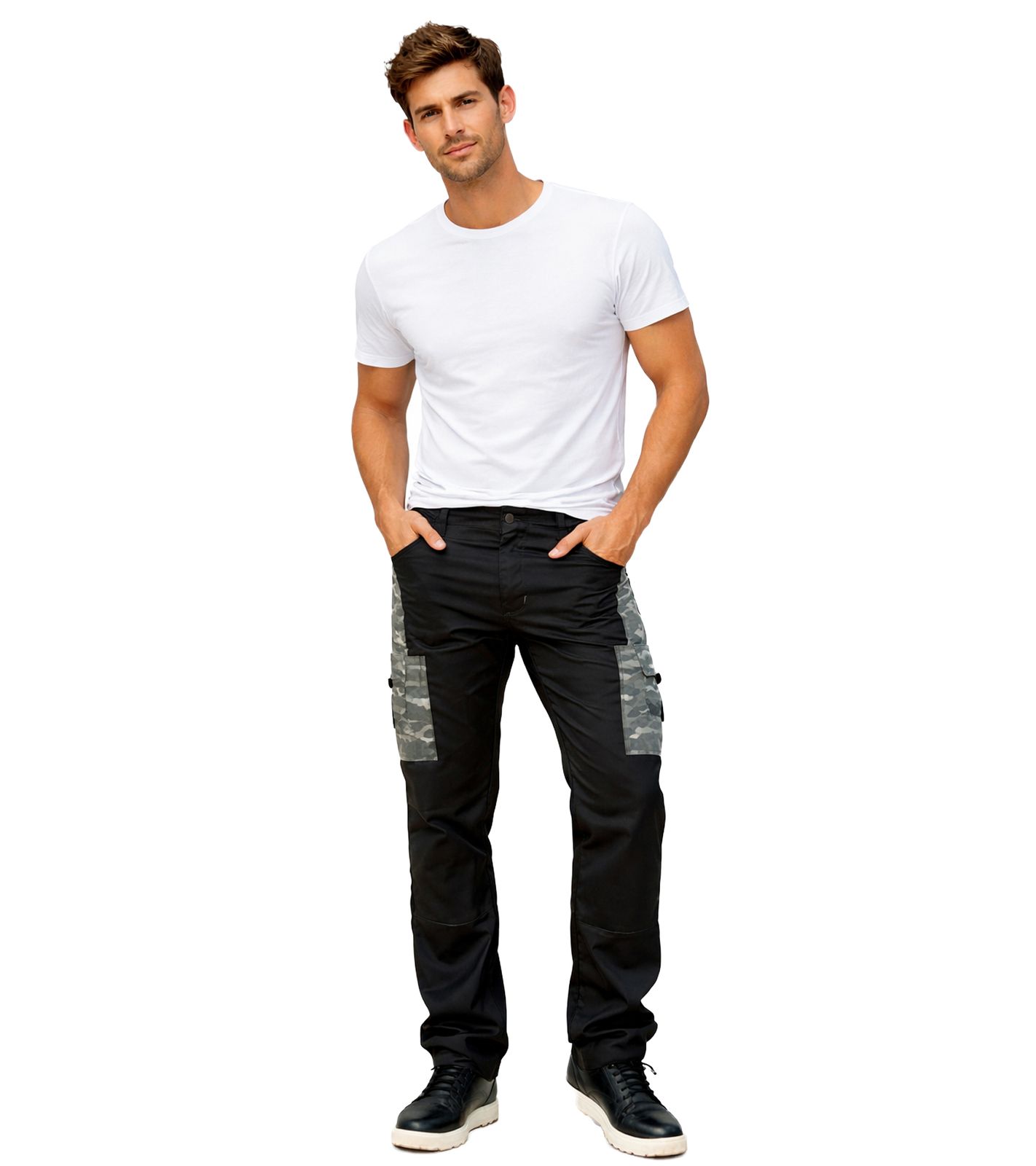 con prácticos bolsillos en las piernas