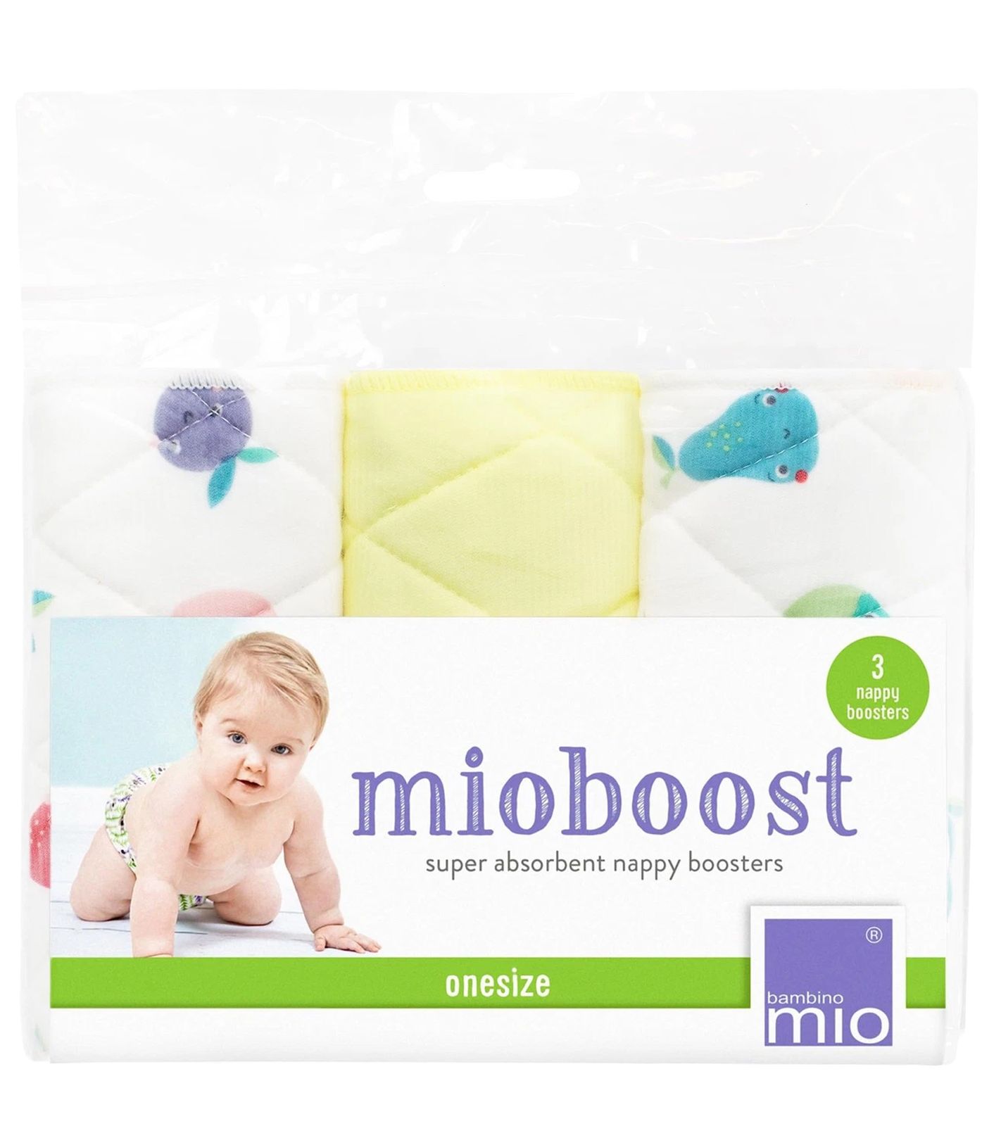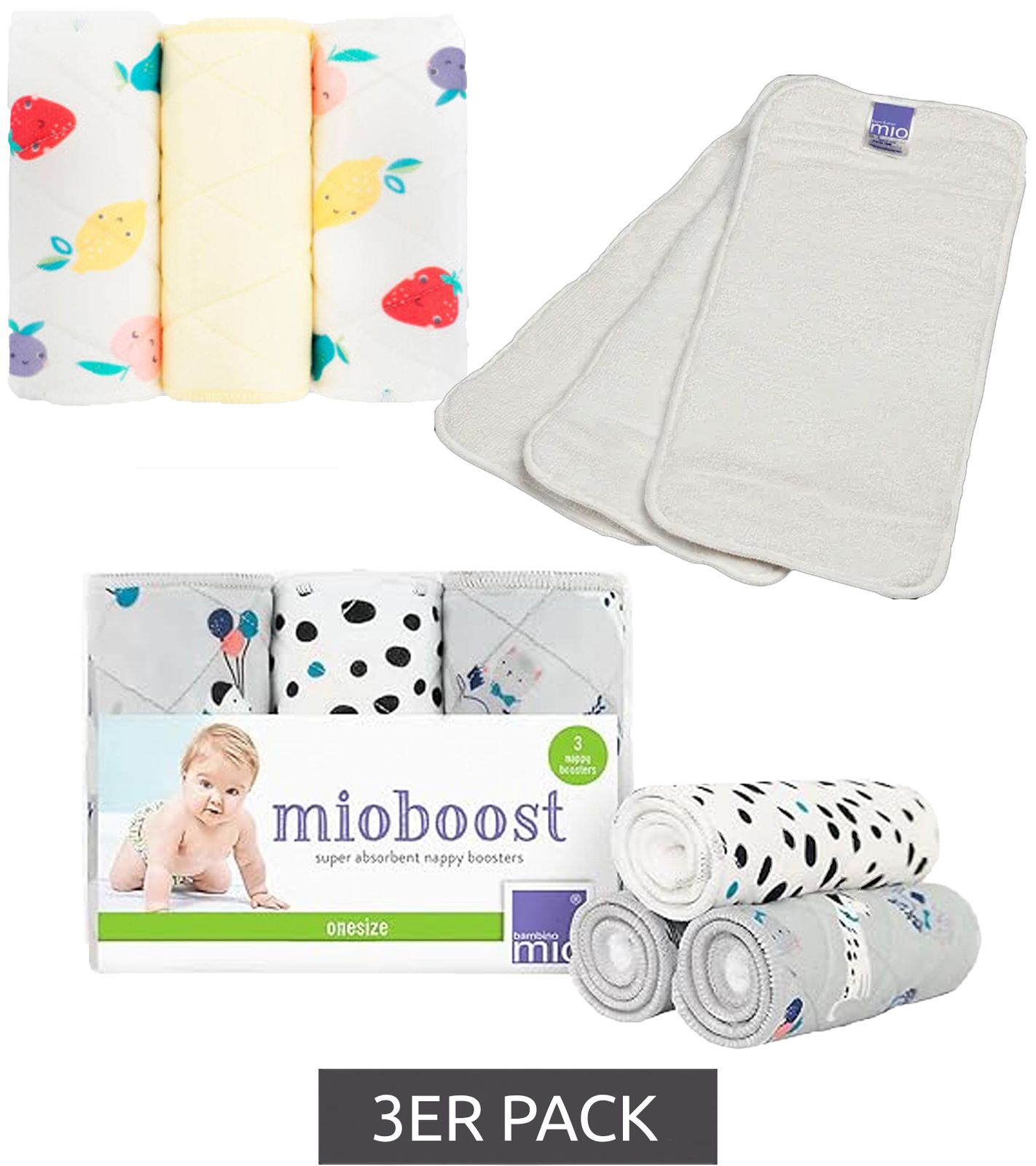 Paquete de 3 insertos absorbentes Bambino Mio para bebés y niños pequeños con capa superior que se mantiene seca, reutilizables, en blanco, liso, con estampado de frutas o animal.