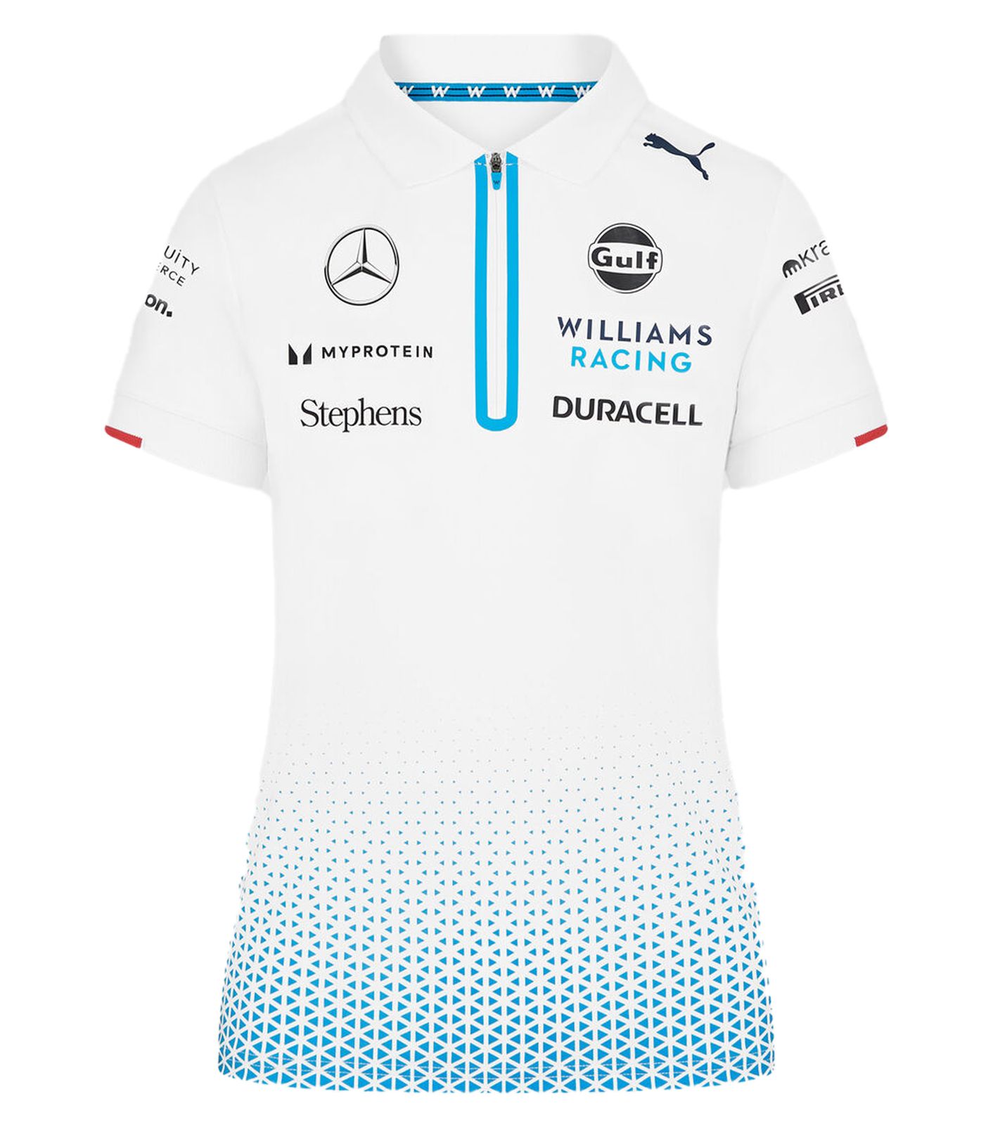 Polo oficial de mujer Williams Racing Equipo 2024 con cuello de cremallera. Este polo presenta el mismo estampado degradado de la colección del equipo 2024, así como todos los logotipos oficiales del equipo y patrocinadores para la temporada 2024 de Fórmula 1.