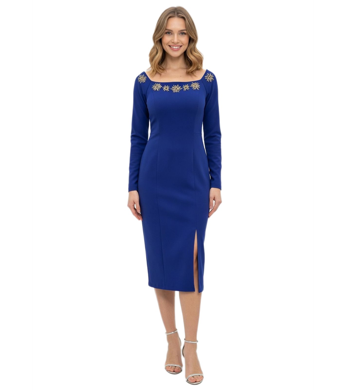 Este vestido midi ajustado con pedrería y manga larga impresiona por su elegante corte.