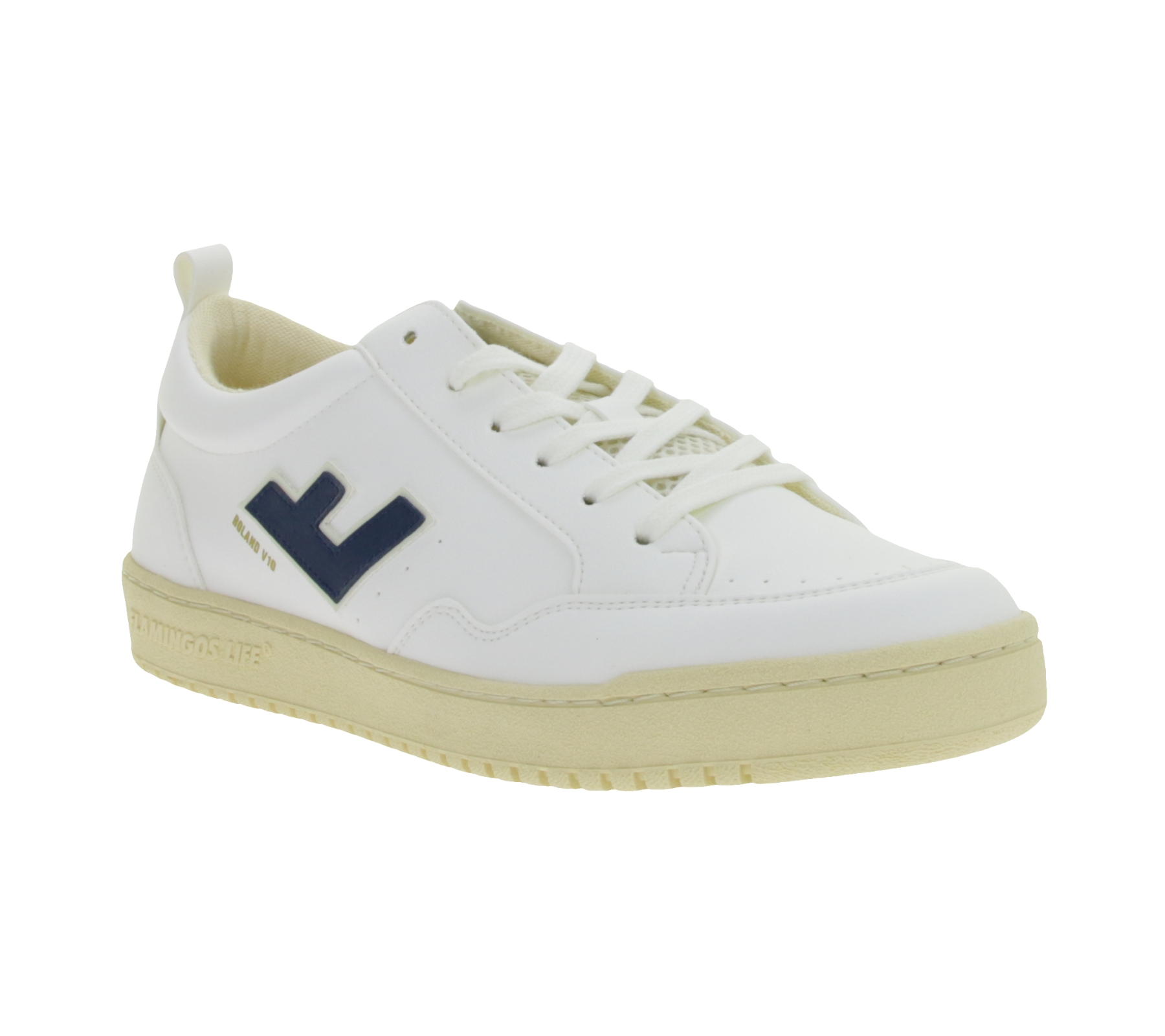 Baskets basses vegan FLAMINGOS LIFE Roland V10 pour femme et homme, fabriquées en Espagne, blanc/bleu foncé
