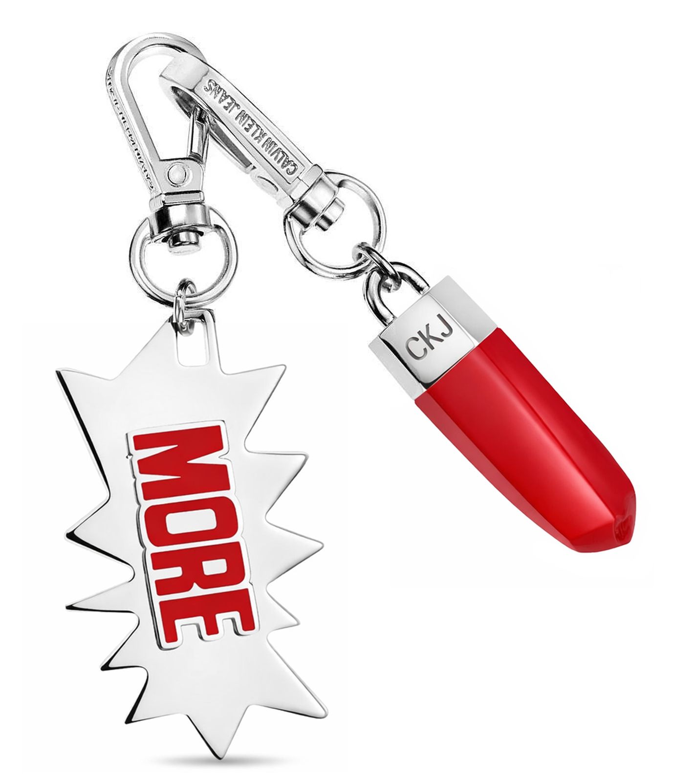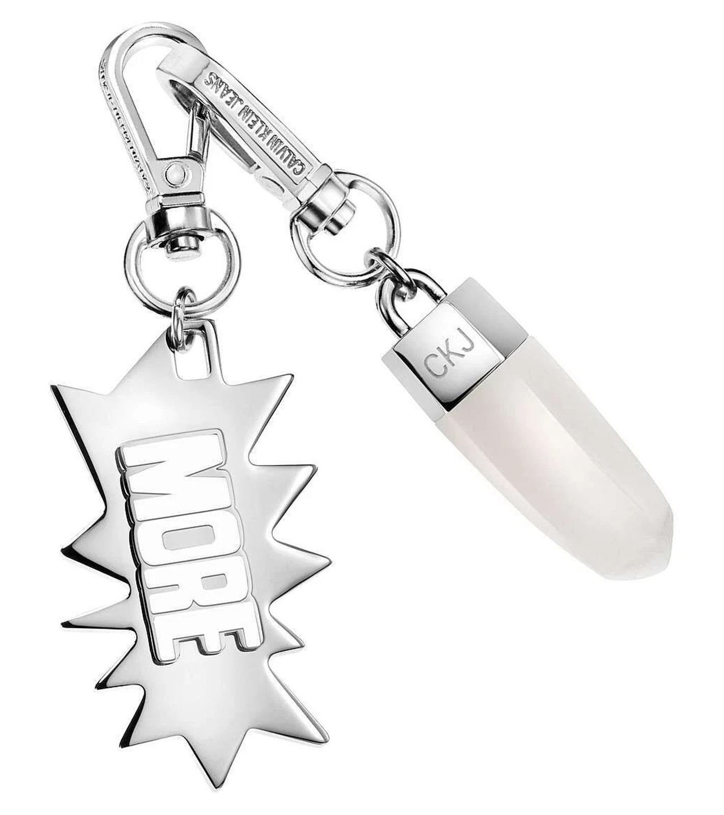 Ensemble de breloques Calvin Klein Downtown : Pendentifs en acier inoxydable avec résine contrastante et logo « MORE » - Accessoires de sac - 7 x 1,3 cm - Argent/Blanc ou Argent/Rouge
