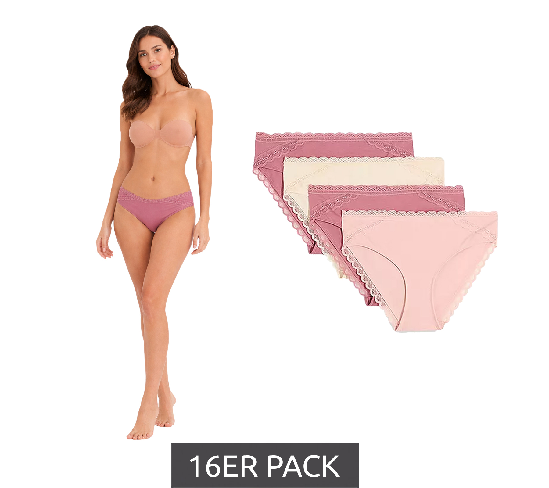 Le lot comprend : 16 culottes – 4 rose clair, 8 roses, 4 beiges