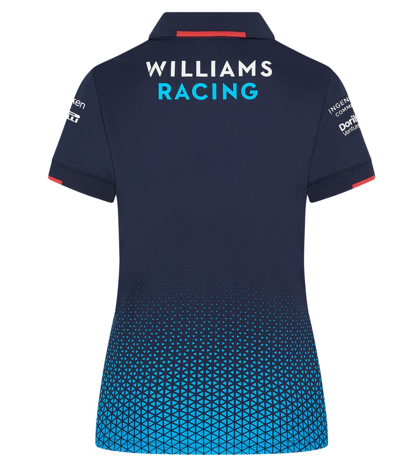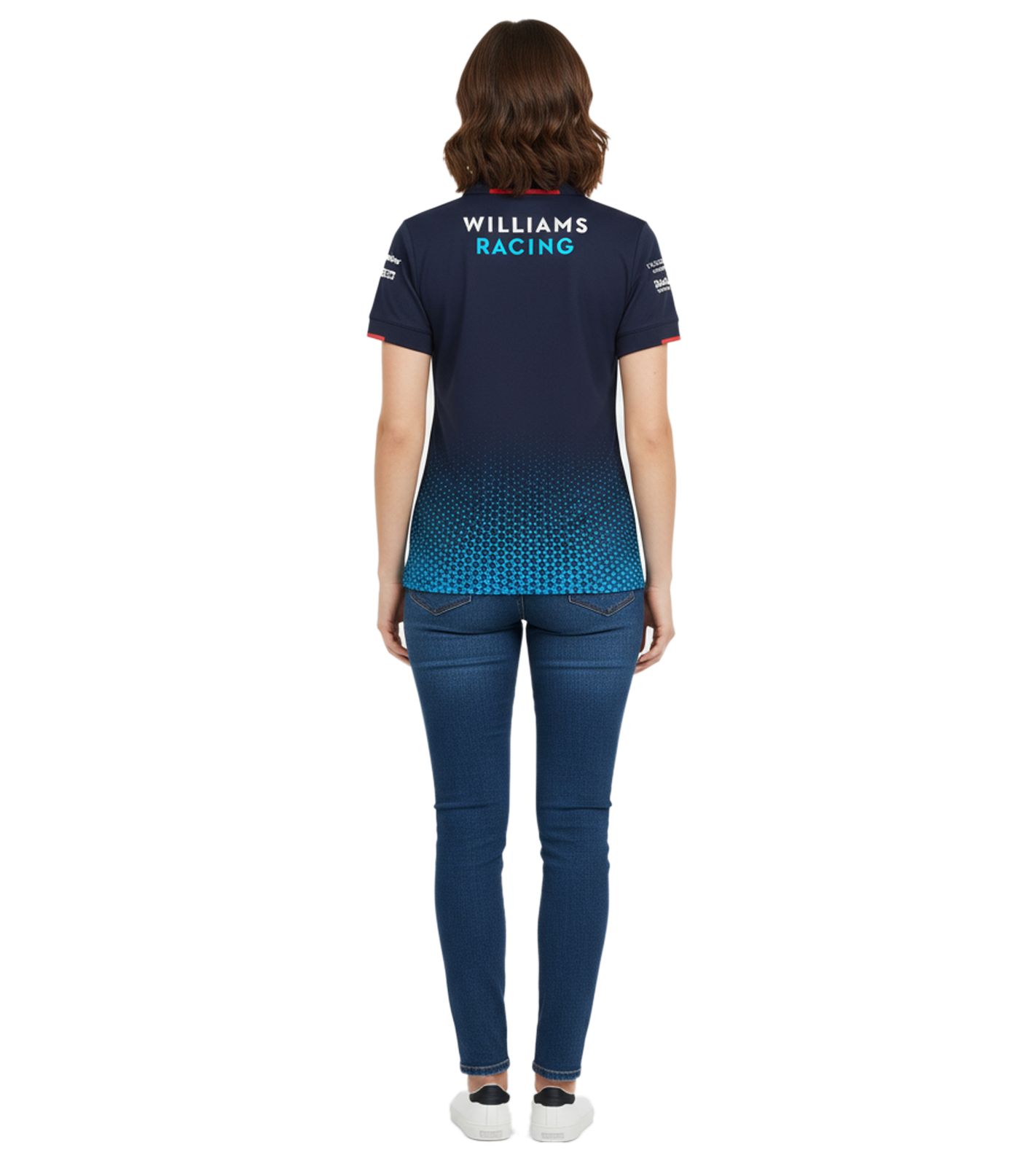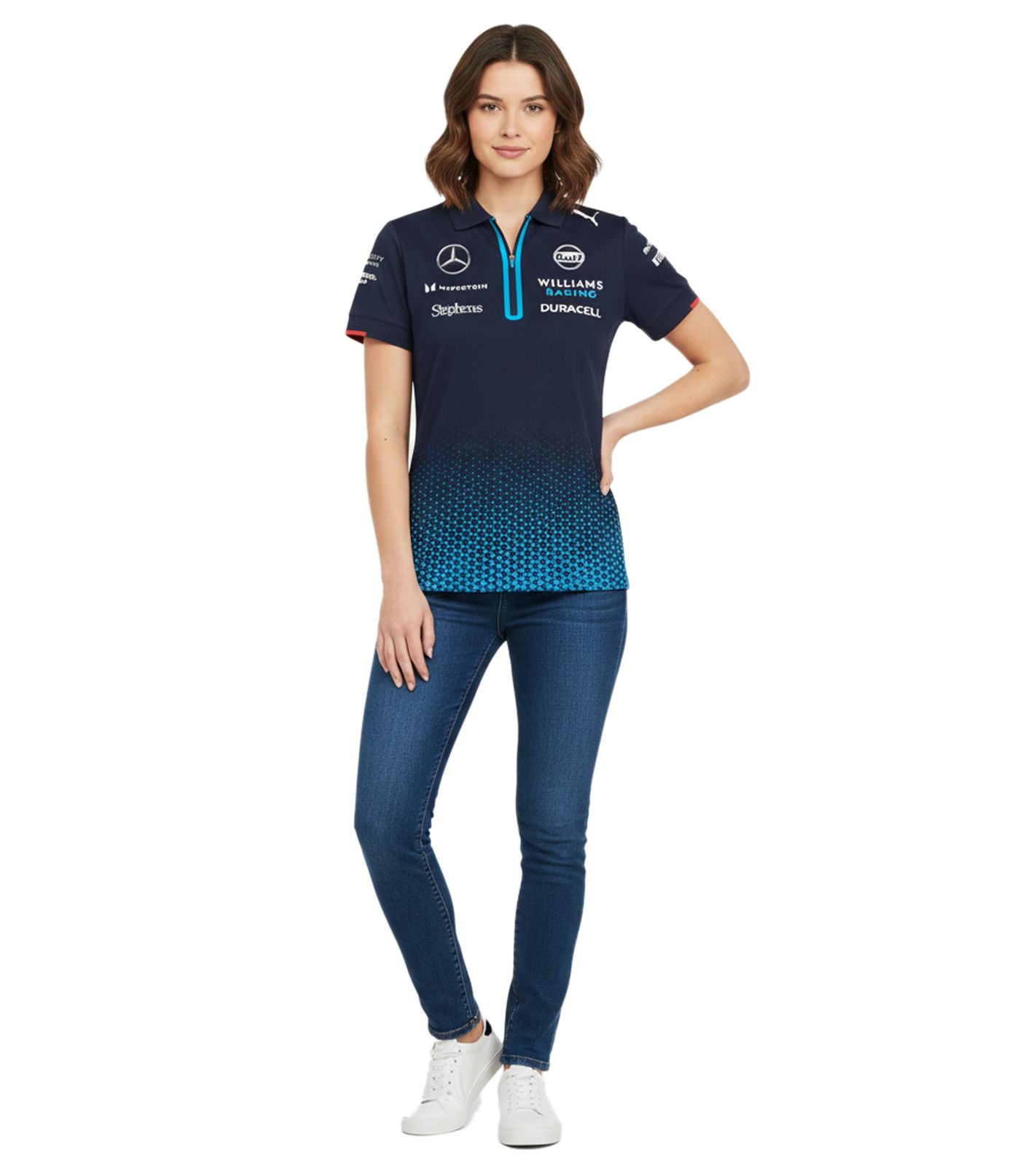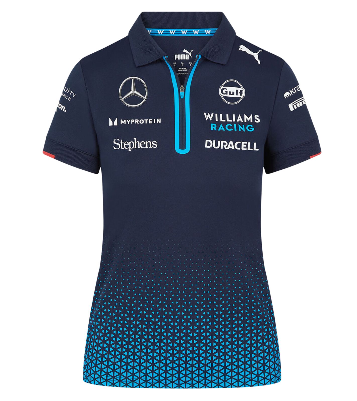Polo femme officiel Williams Racing Team 2024 avec col zippé. Ce polo arbore le même imprimé dégradé que l'ensemble de la collection 2024 de l'écurie, ainsi que tous les logos officiels de l'équipe et des sponsors pour la saison 2024 de Formule 1.