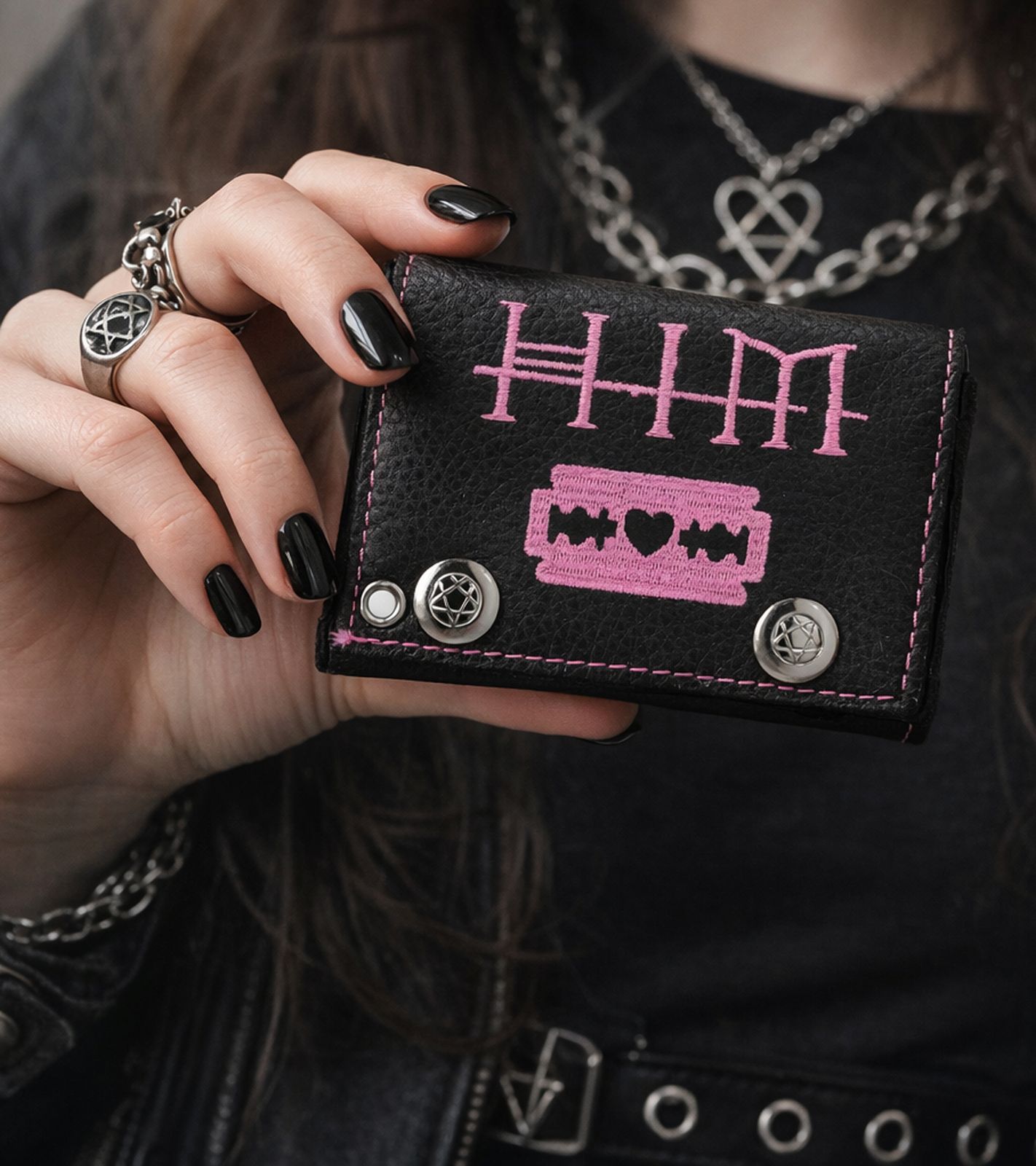 Un petit œillet métallique est également présent sur le bord inférieur gauche. Ce portefeuille plaira particulièrement aux amateurs de musique et de mode alternatives.
