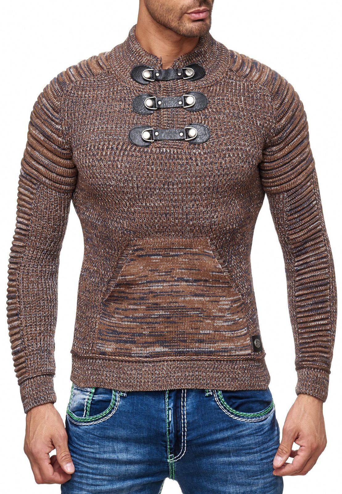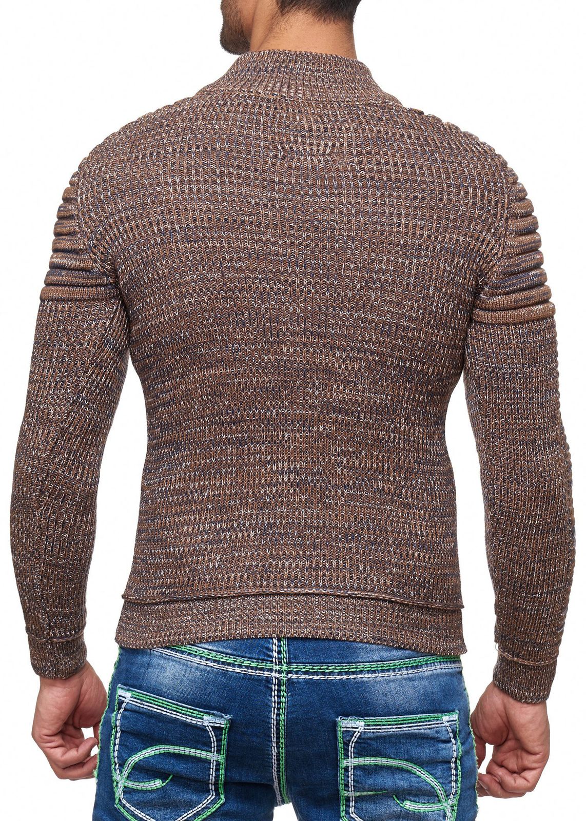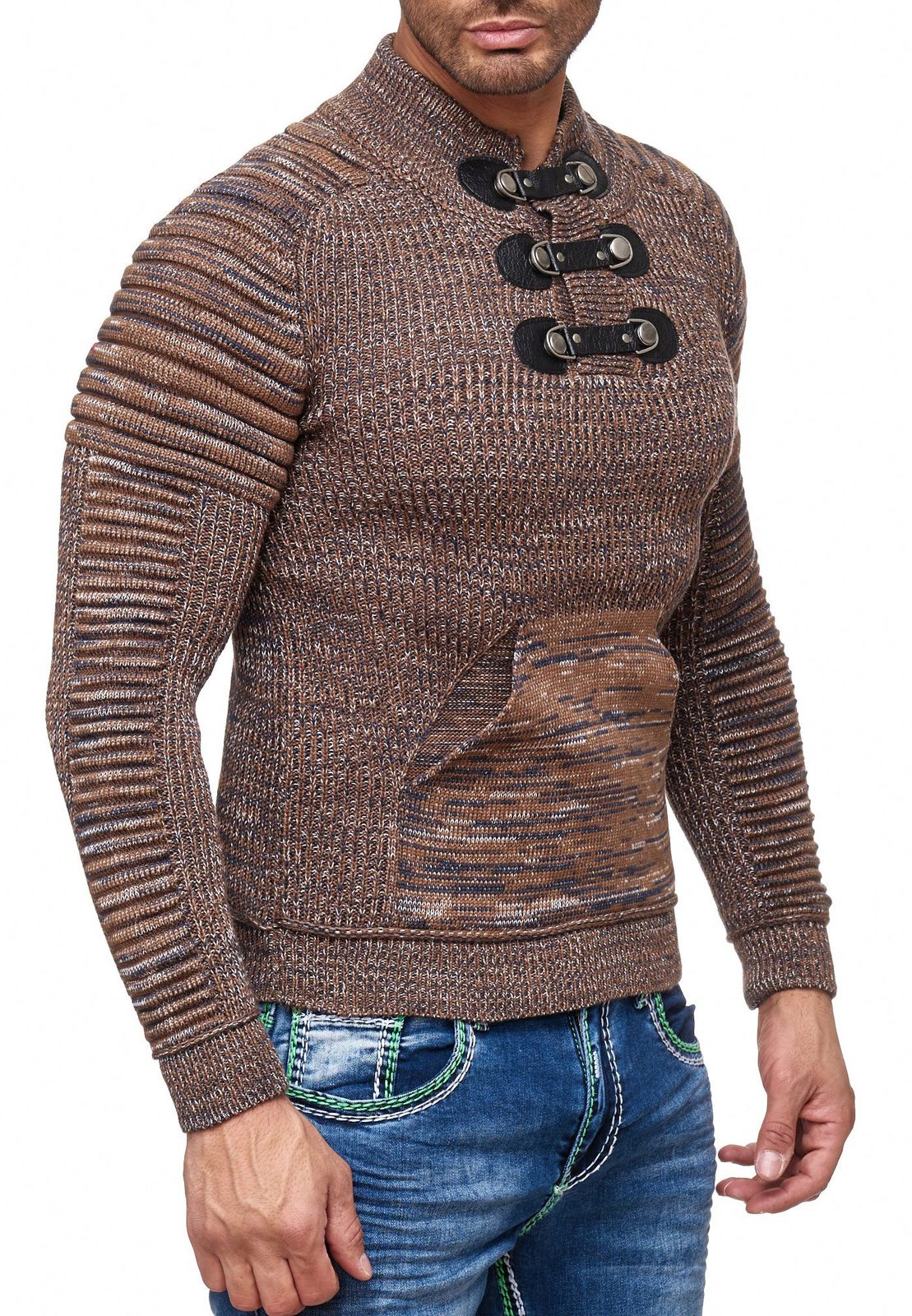 Pull homme en grosse maille texturée, col montant et fermeture à col. Modèle 13299 Camel.