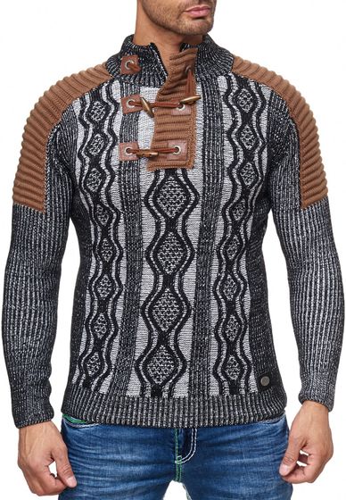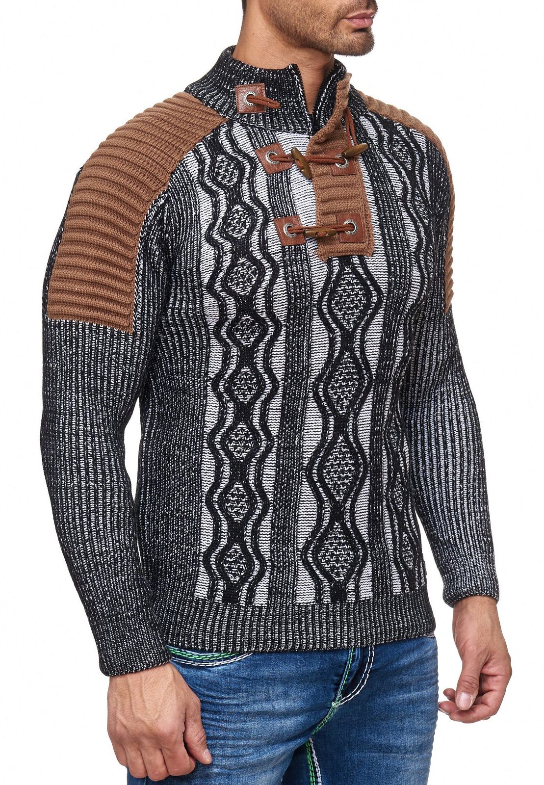 Pull homme en maille contrastée, col montant et fermeture à brandebourg. Modèle 13285 Noir/Blanc