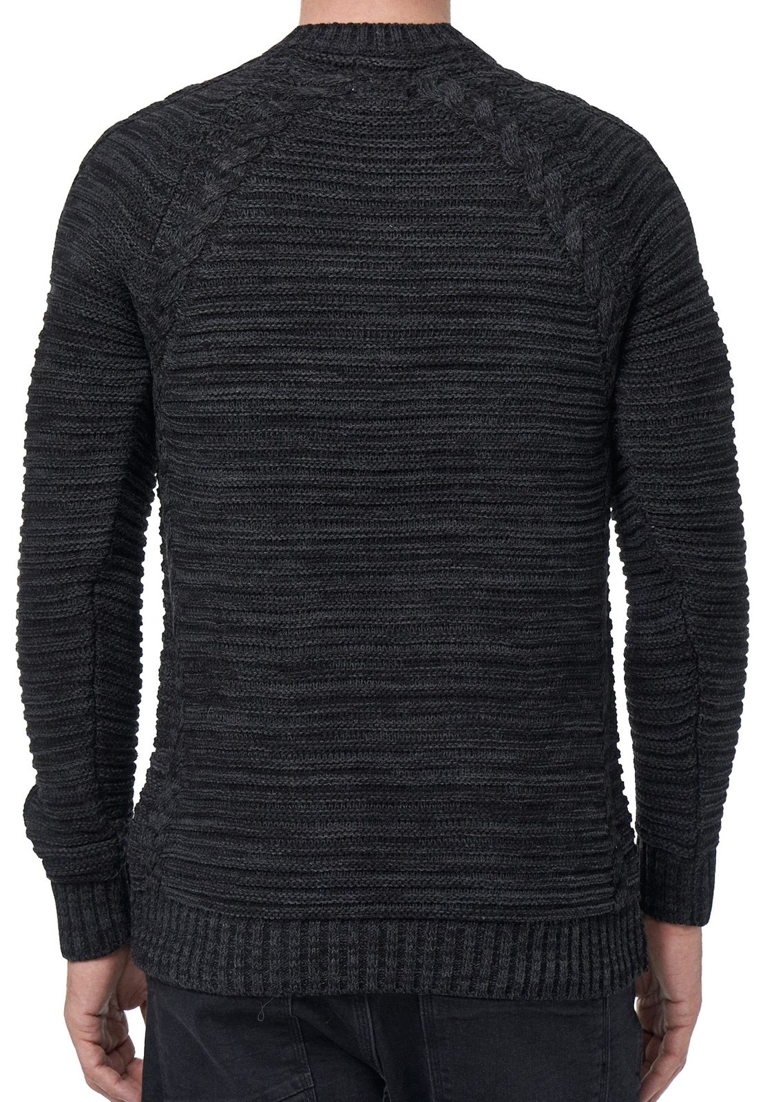 Pull homme moderne en grosse maille, col rond, coupe ajustée, orné de torsades (réf. 13386, noir).