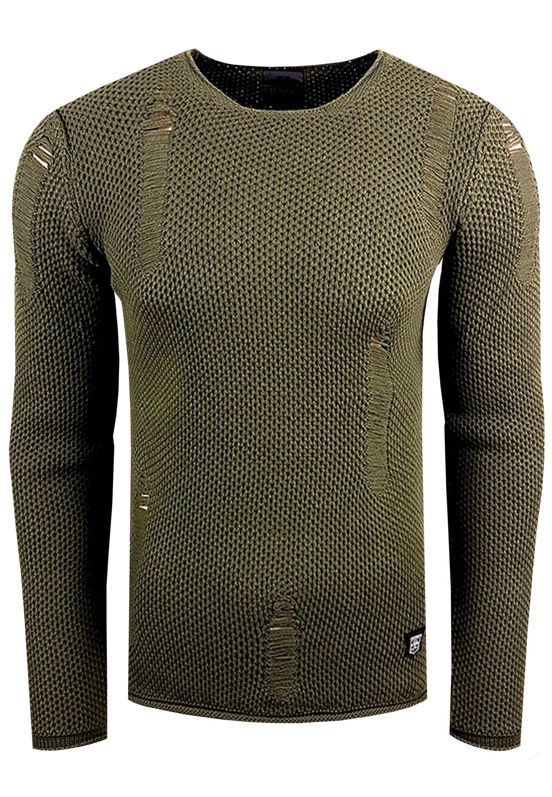 Pull homme moderne en maille texturée, coupe ajustée, effet usé, réf. 13249 Kaki