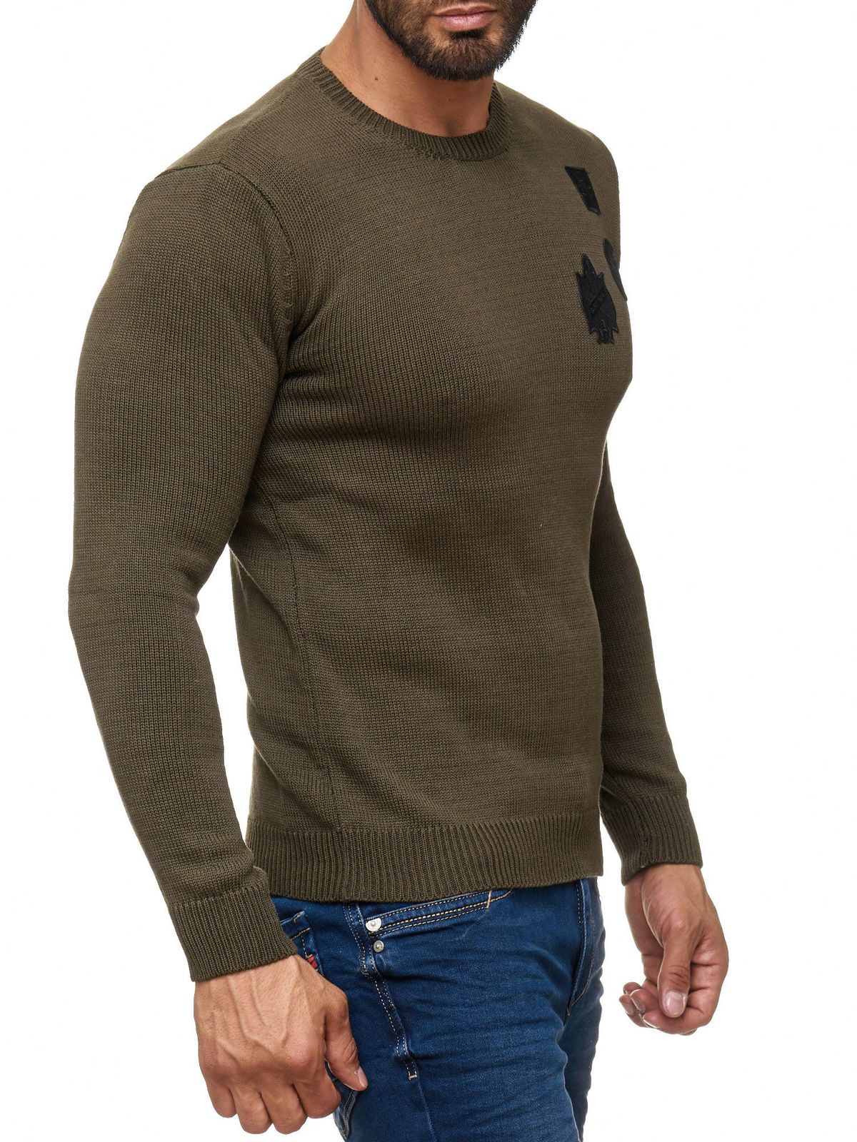 Pull homme tendance à col rond avec écussons, en maille style militaire 13297 Kaki