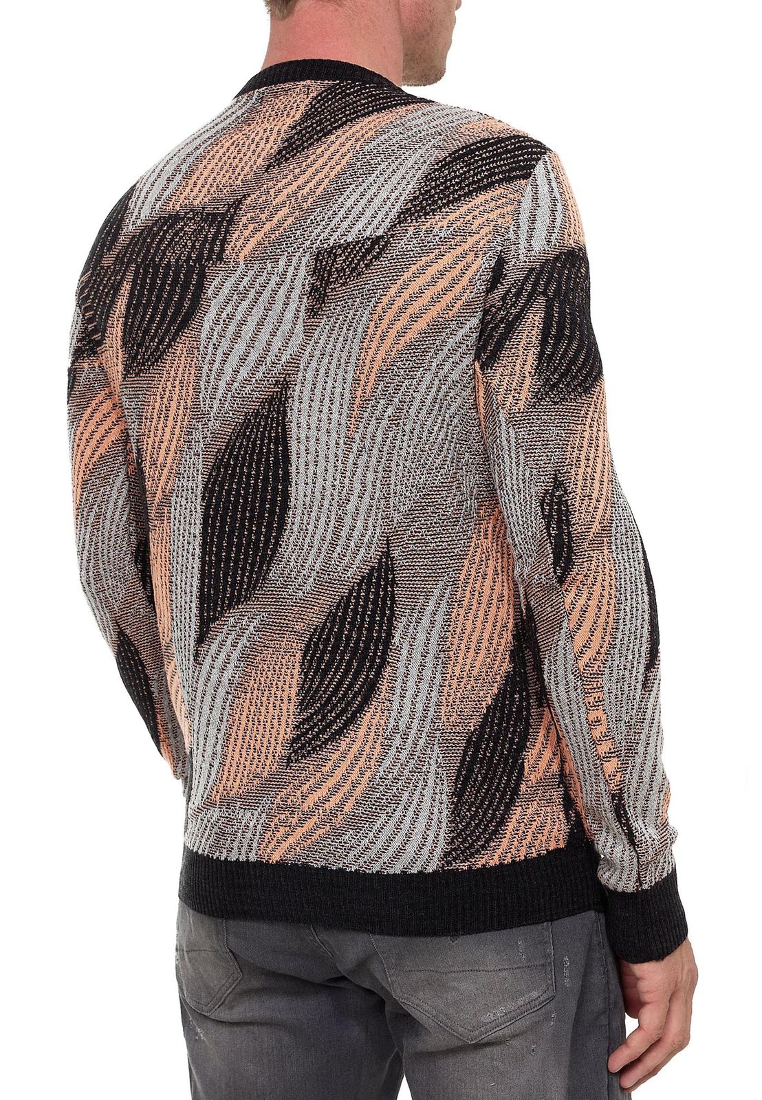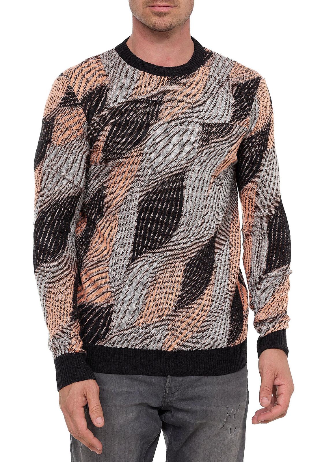-93% Pull homme tendance à col rond, motif vagues, maille fine 13445 Orange