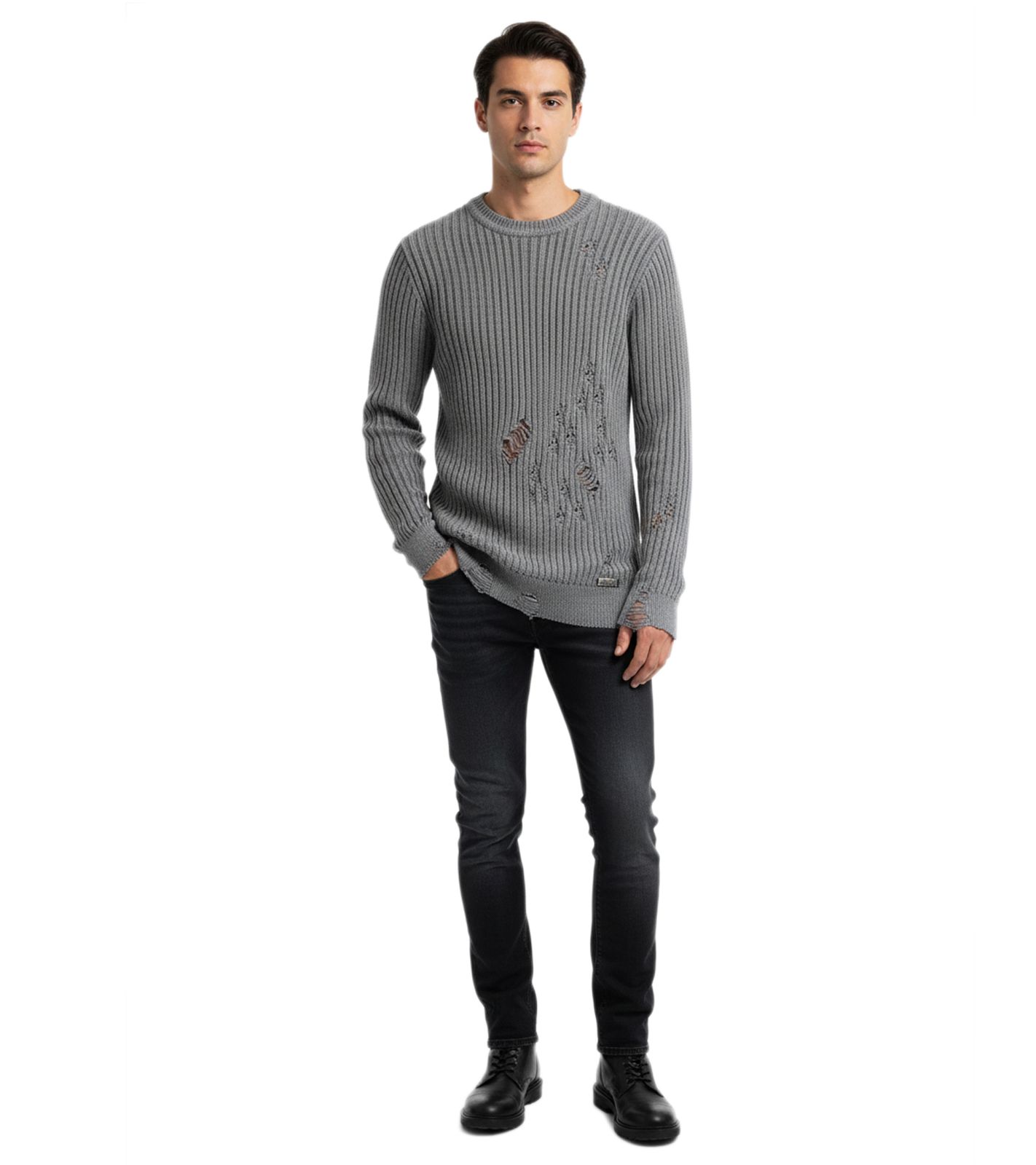 Pull motard urbain pour homme, col rond, style délavé moderne avec détails usés 13293 Gris