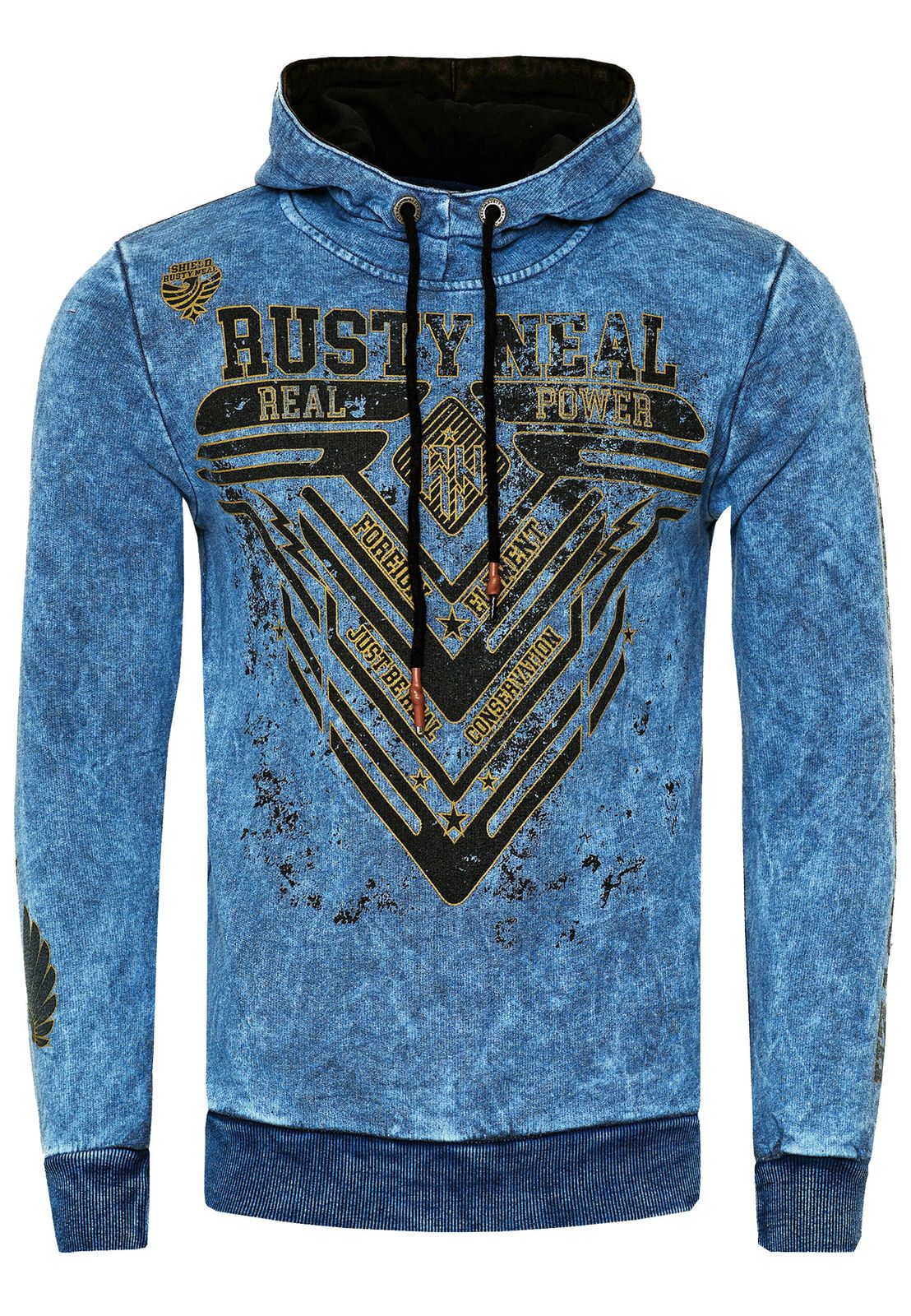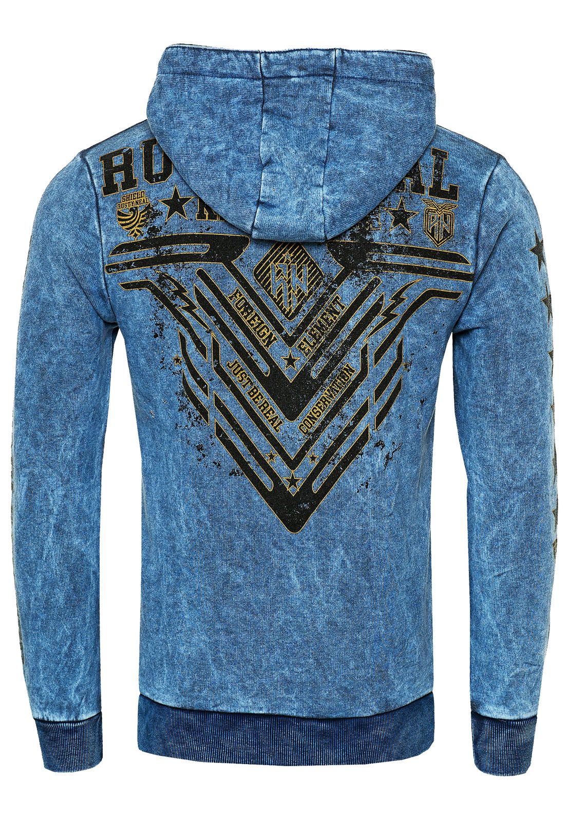 Sweat à capuche pour homme au design original, en denim délavé à l'huile avec imprimé graphique, référence 19126 Sax-Blue.